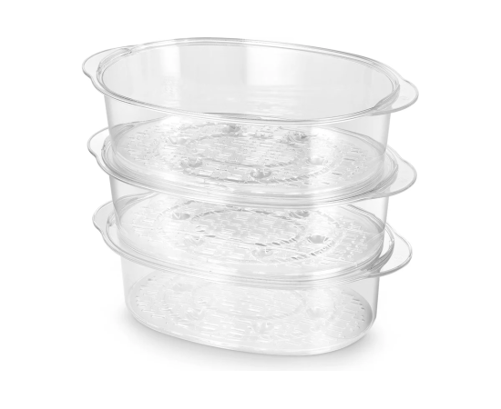 Пароварка оснащена тремя паровыми корзинами, что позволит приготовить обед или ужин из нескольких блюд сразу на всю семью.
