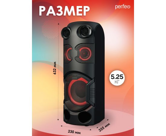 Беспроводная колонка Perfeo Power Box 75 - это громкая, мощная, беспроводная колонка с чистым звуком на 75 Вт в комплекте с эквалайзером, пультом ДУ и подсветкой. Портативная блютуз колонка универсальная, подходит для телефона, смартфона, планшета, ноутбука. Подключается посредством блютузом или кабелем через AUX разъем, а встроенный в беспроводную напольную колонку плеер воспроизводит micro sd и usb флешкой карты памяти. Радиоприемник с проигрыванием FM радиостанций для любителей использовать портативку как аудиосистема. В комплекте идет беспроводной микрофон! Также есть два входа для микрофона, чтобы исполнять караоке или подключать электро-гитару. Музыкальная колонка Power BOX 75 от Perfeo – это мощная, переносная станция с подсветкой и караоке для применения на даче, для дома, улице, или озвучивания спортзала, танцевальных занятий, йоги, фитнеса. Мобильная акустическая система со светомузыкой и эквалайзером позволит вам 8 часов наслаждаться чистым звуком и любимыми песнями. Мы указываем честное время проигрывания музыки. Это отличный подарок как для подростков и детей: мальчиков и девочек, так и для взрослых. Супер предложение для того чтобы стать центром шумной вечеринки. Динамическая RGB-подсветка, способная раскрасить ваше пространство. Режимы подсветки помогут адаптировать работу светомузыки под разные мелодии — от динамичных треков, до спокойной, размеренной мелодии. За качественное звучание отвечают ПЯТЬ динамиков. Портативная акустическая система — это не просто большая беспроводная колонка, а настоящий мобильный центр развлечений. Надежный инструмент для проведения шумных мероприятий, будь то свадьба, для праздников, дискотека или умиротворенная медитация. Отличный подарок на новый год! Для детских праздников. Для спортивных мероприятий. С портативностью и качеством звука, эта колонка гарантирует удобство использования. Ее дизайн и функциональность сделают любую вечеринку незабываемой.