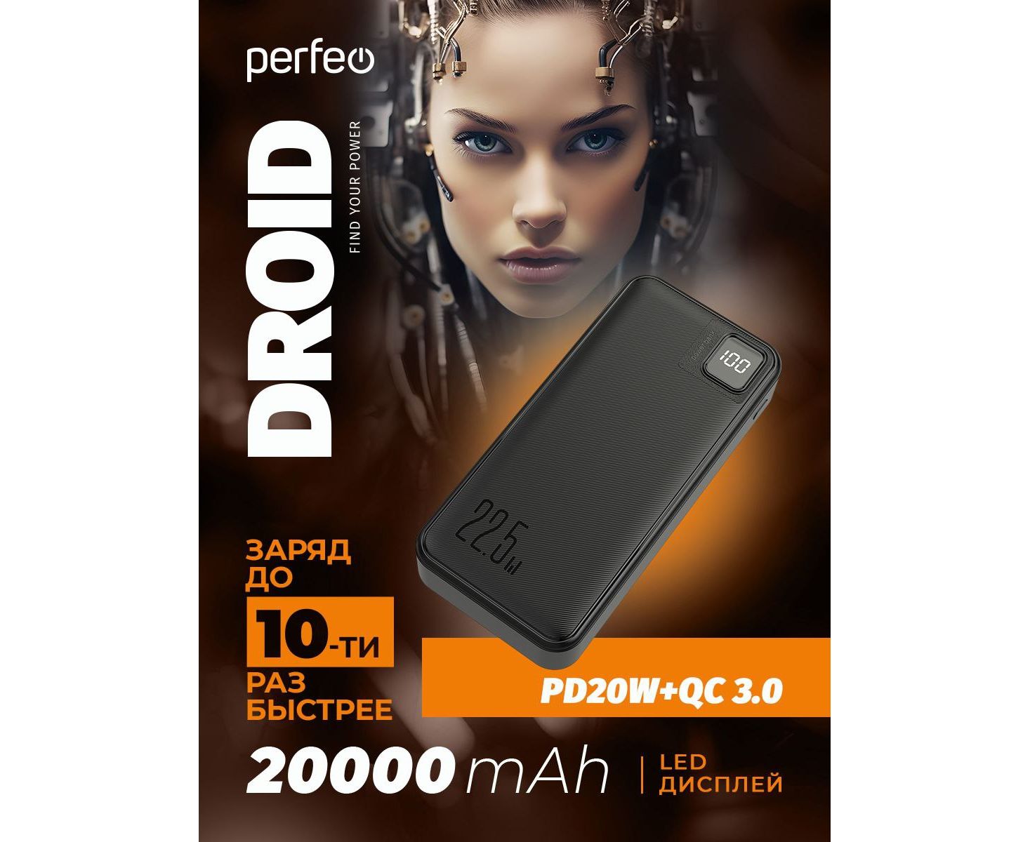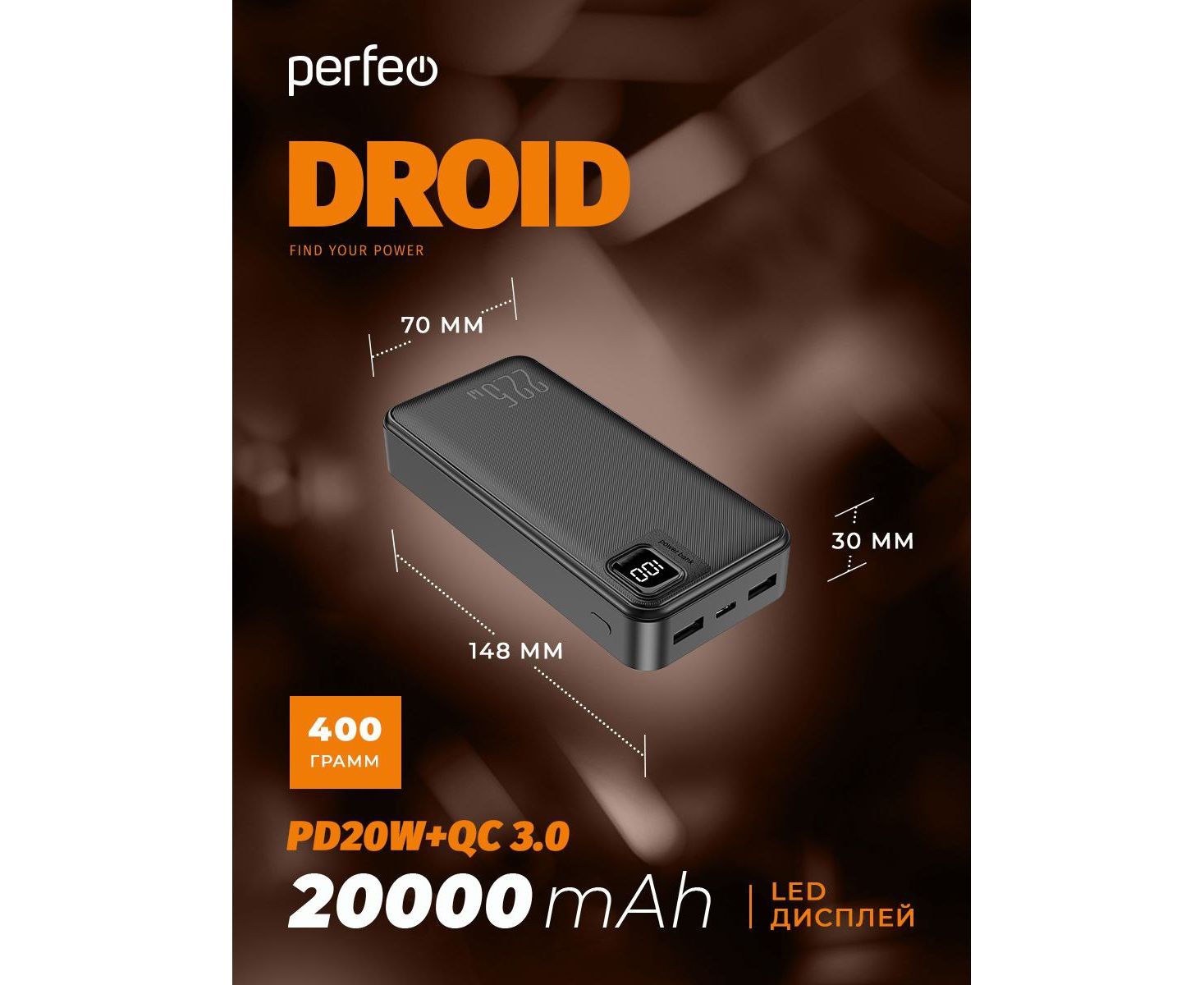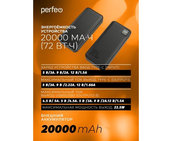 Повербанк Perfeo DROID 20000 mAh/LED дисплей/PD + QC 3.0/Type-C/2 USB/Выход: 5A, max 22.5W/ черный