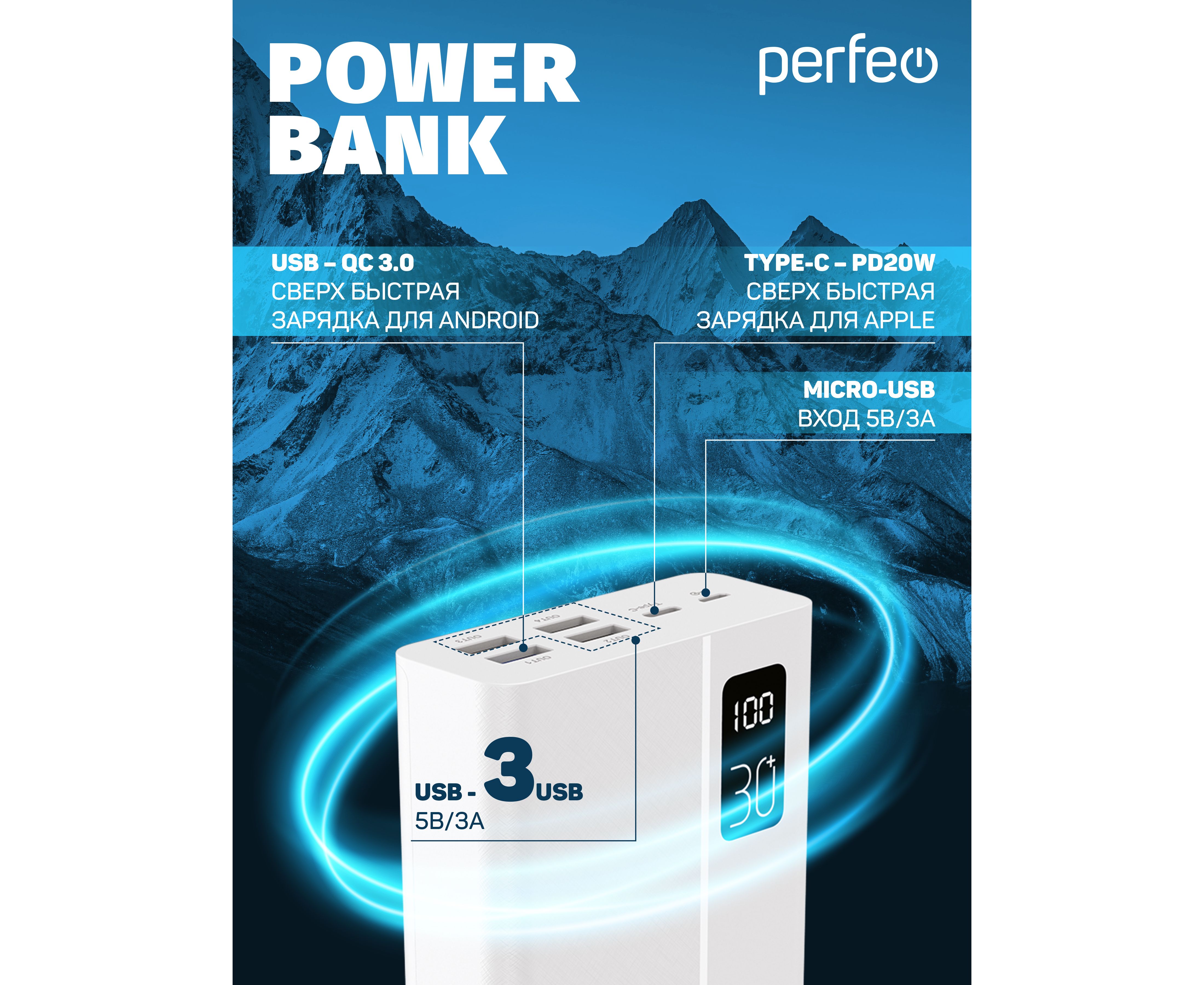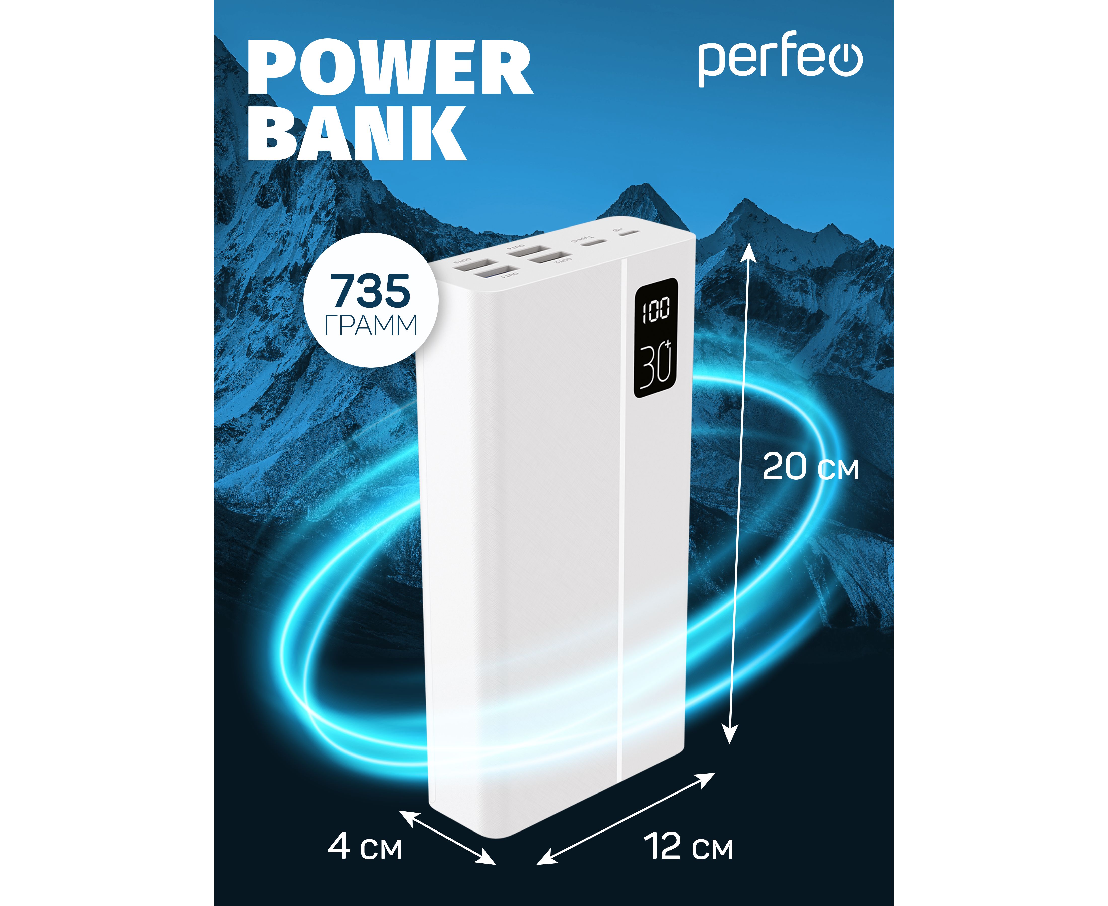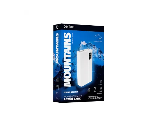 Повербанк Perfeo MOUNTAINS 30000 mAh/LED дисплей/PD + QC 3.0/Type-C/4 USB/Выход: 3A, max 22.5W/White