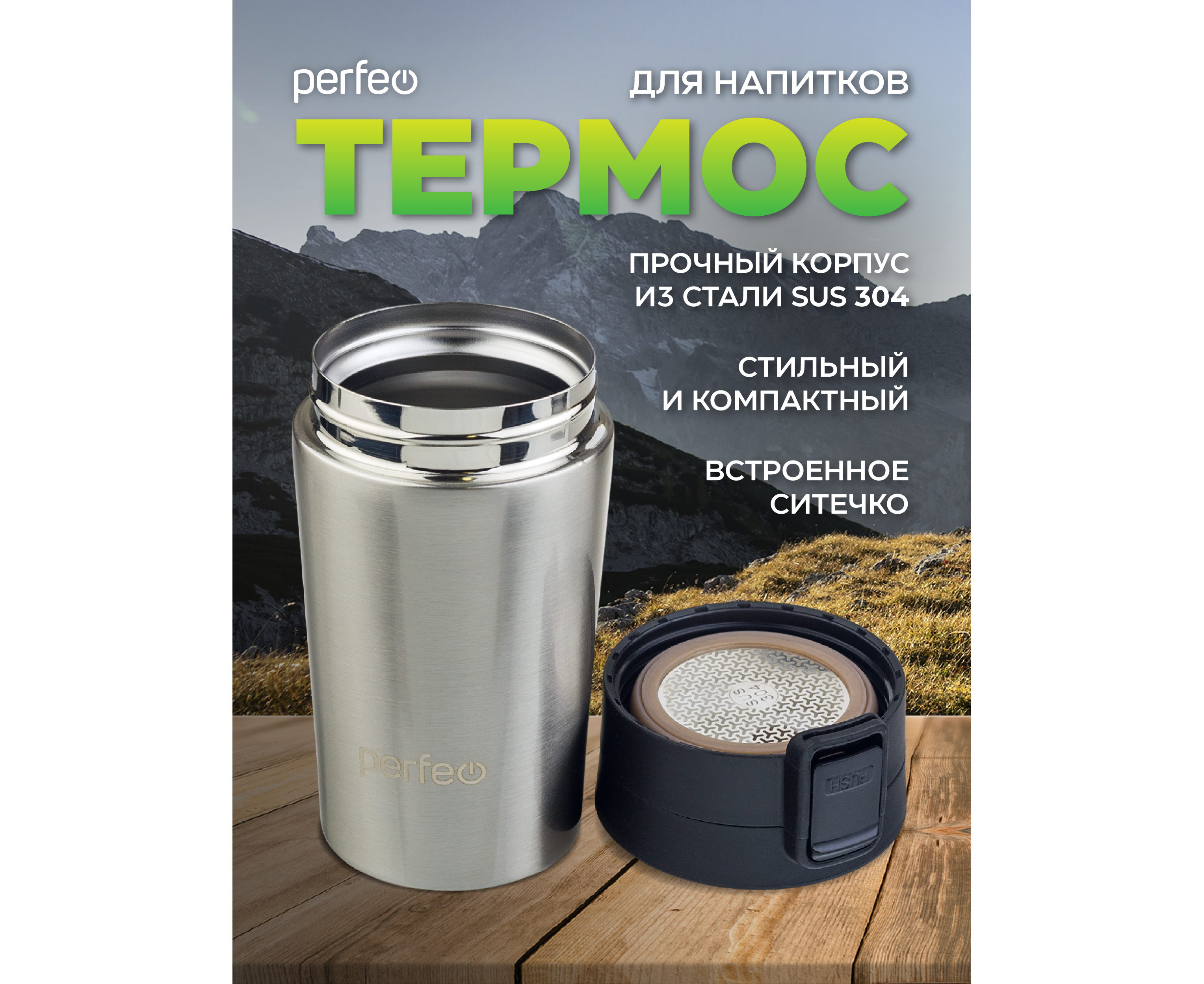 Термокружка для напитков PERFEO с крышкой-поилкой, ситечком, объем 0,25 л., нержавеющая сталь (PF_C3727)