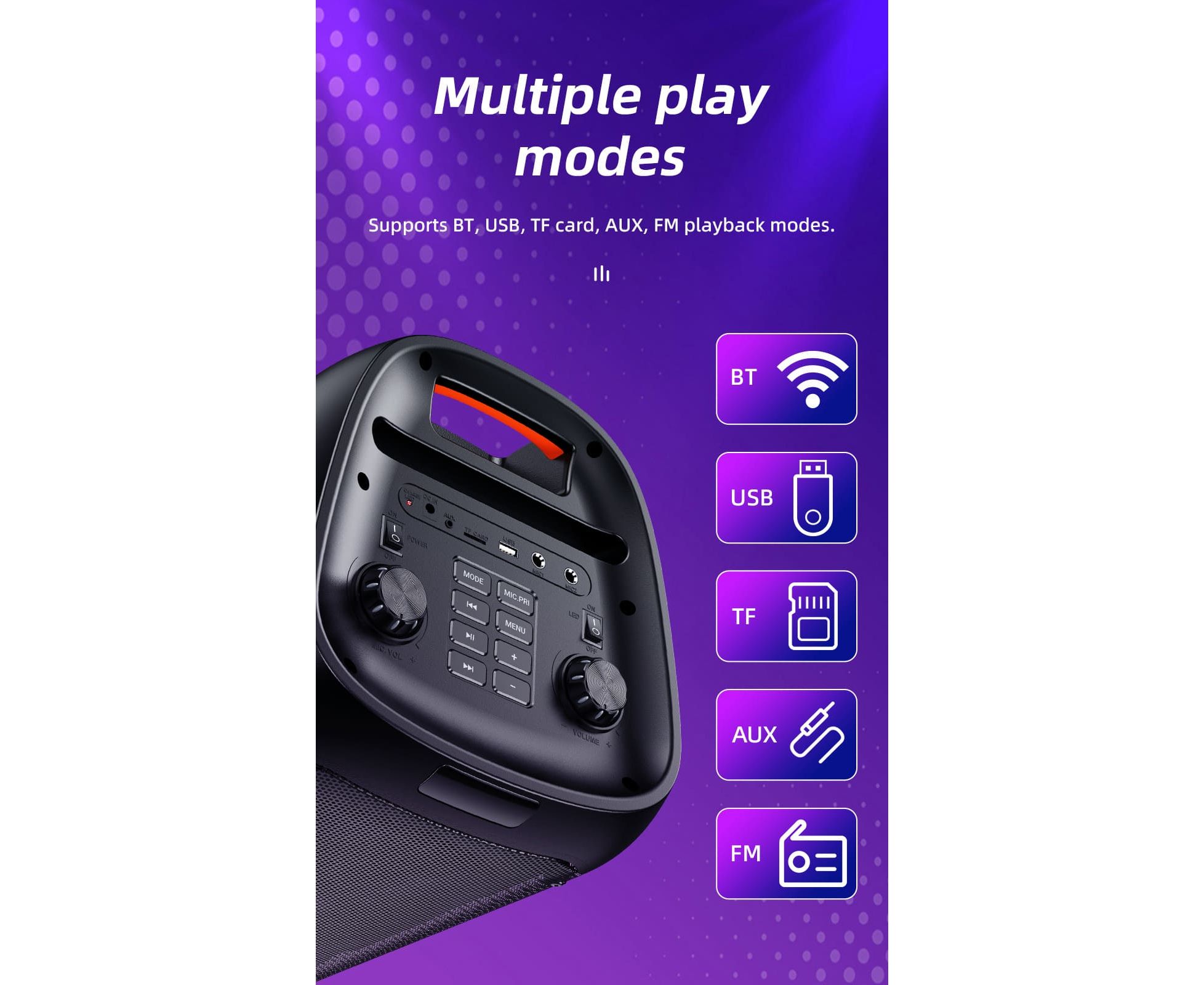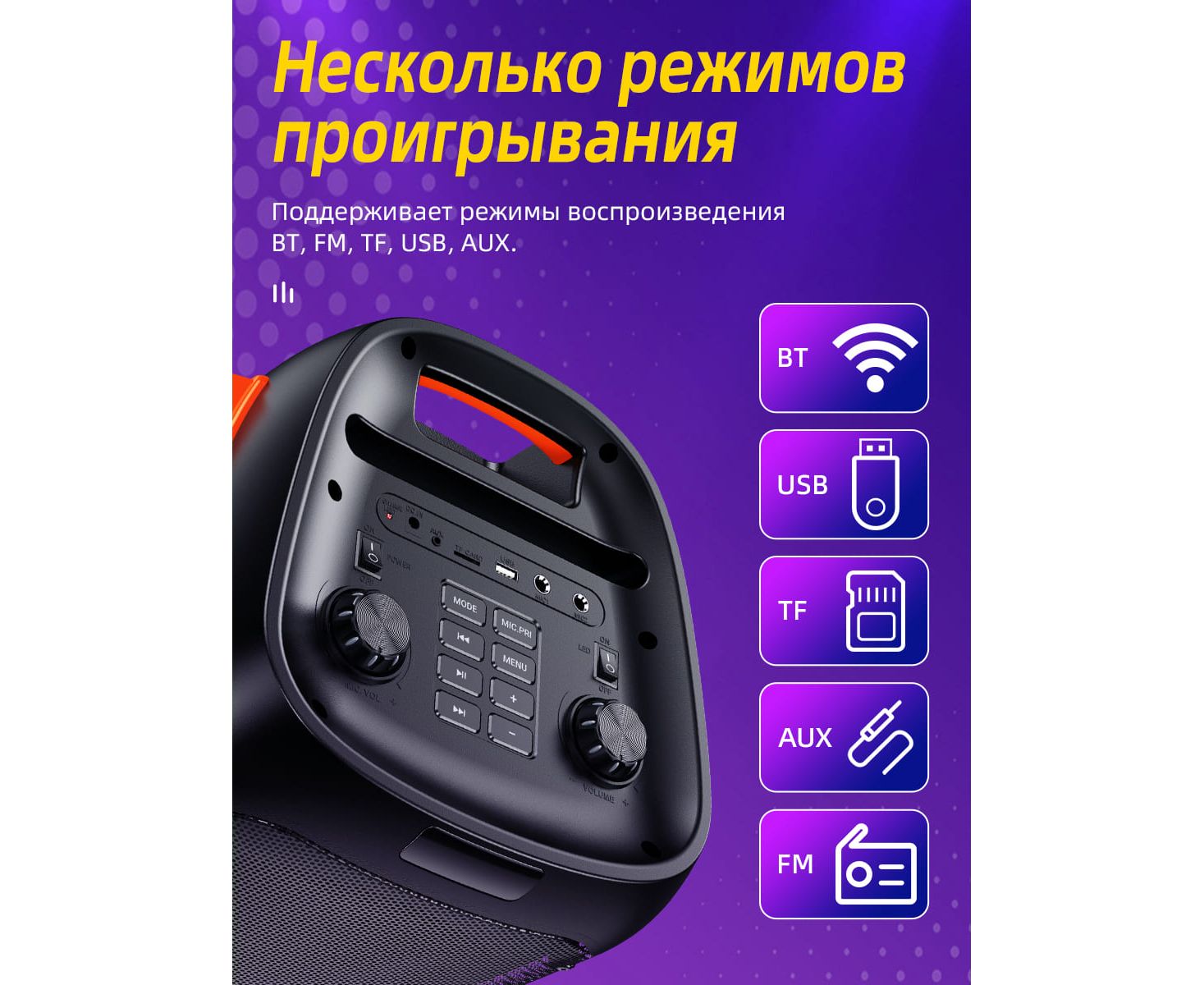 Поддерживает BT, TF-карту, USB-накопитель, AUX, FM и другие режимы.