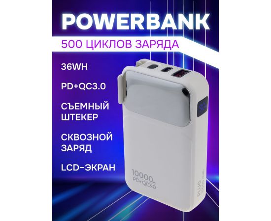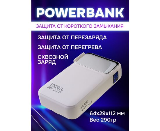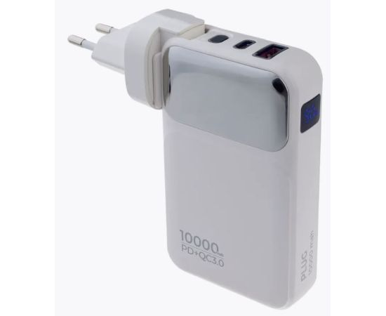 Портативное зарядное устройство Perfeo PLUG 10000 mAh/LED дисплей/Вход 230V/PD+QC 3.0/Выход: 5A, max 22.5W/ цвет - белый