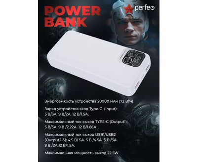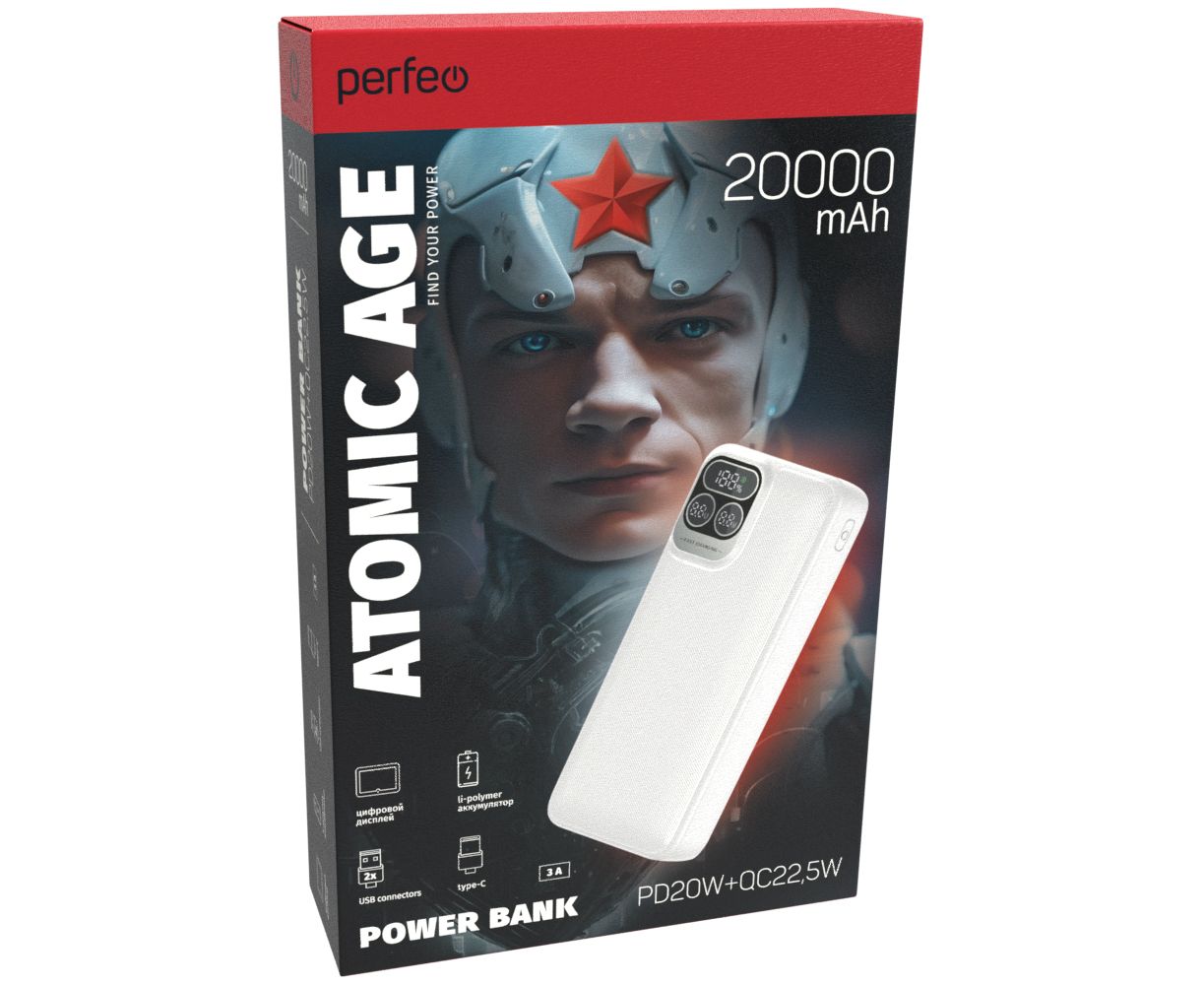 Повербанк Perfeo Atomic Age 20000 mAh/LED дисплей/PD + QC 3.0/Type-C/2 USB/Выход: 5A, max 22.5W/ Белый