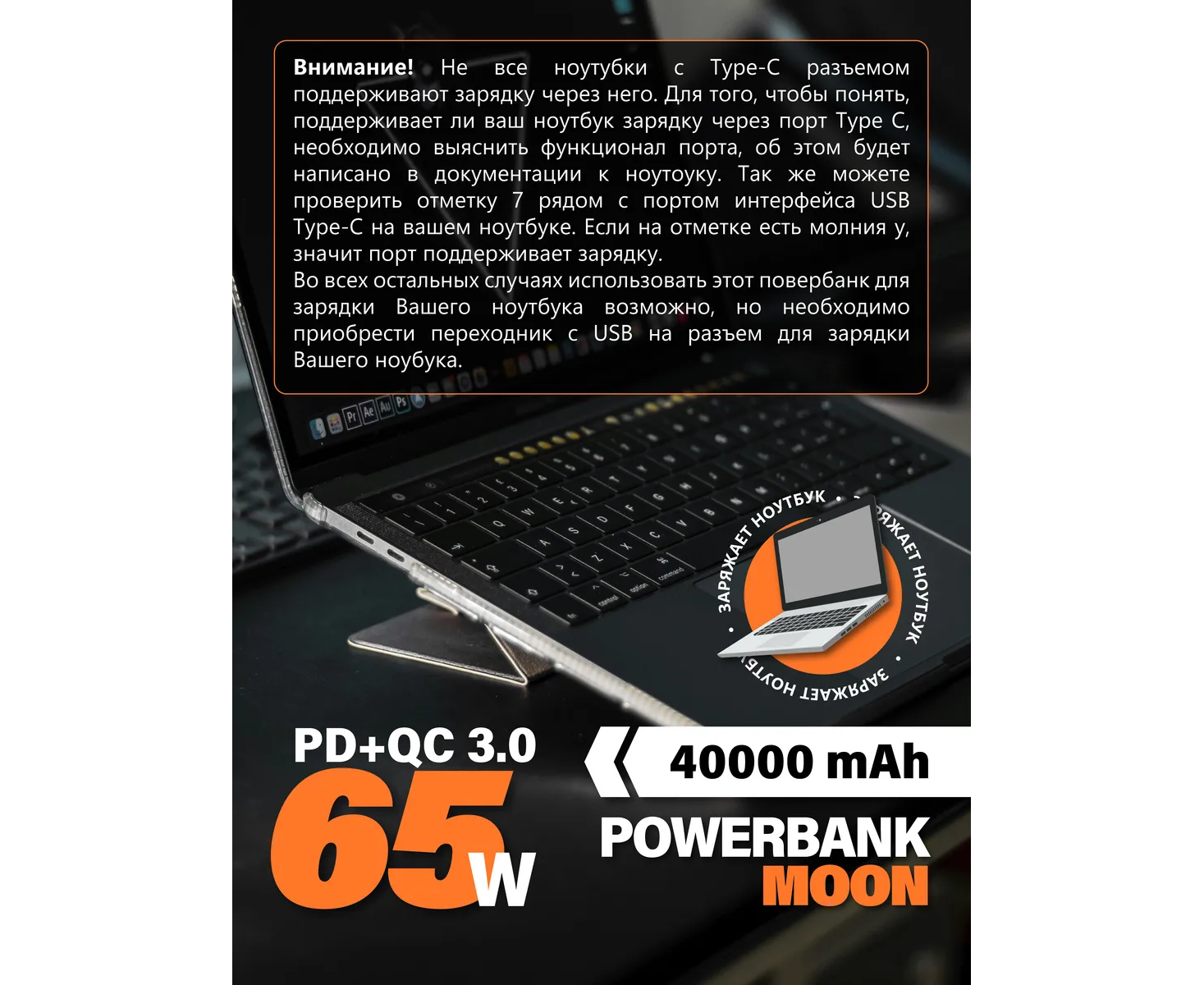Внимание! Не все ноутбуки поддреживают зарядку через Type-C. Более подробно описали на слайде, см фото. Внешний аккумулятор Moon 40000 mAh – это незаменимый гаджет для тех кто часто находится в пути и нуждается в дополнительной зарядке своих устройств. Ёмкость в 40000 мА*ч, повербанк обеспечивает достаточно мощности для нескольких циклов зарядки телефона, планшета, может зарядить ноутбук. Одним из главных преимуществ этого аксессуара является наличие нескольких видов разъемов (USB-A, Type-C), что позволяет подключать различные устройства одновременно и заряжать их быстро и эффективно. Материал корпуса выполнен из высококачественного поликарбоната, что делает его одновременно легким и прочным. Встроенная защита от перегрева, перезаряда и короткого замыкания гарантирует безопасность использования. Дополнительная опция портативного зарядного устройства включает возможность зарядки малым током, которая подходит для беспроводных наушников, смарт часов и фитнес браслетов. Функция сквозной зарядки позволяет одновременно заряжать до трех устройств, а возможность быстрой подзарядки делает его идеальным выбором для тех, кто ценит свое время и всегда хочет быть на связи. Повербанк поддерживает протоколы быстрой зарядки QC 3.0 и PD. Максимальный выходной ток 3.25А обеспечивает очень быструю зарядку ваших устройств. Благодаря своей универсальности и наличию различных гнезд, переносной аккумулятор может быть использован для зарядки любой электроники, включая модели iPhone и Android. Универсальный и стильный внешний аккумулятор Moon станет незаменимым помощником для всех, кто ценит удобство, функциональность и возможность всегда оставаться на связи. . Характеристики по выходным напряжениям и токам указана на отдельном слайде.