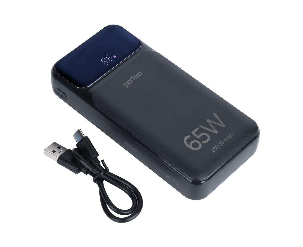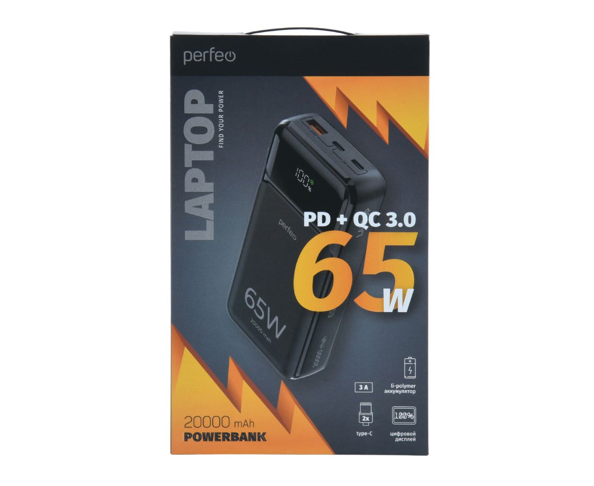 Powerbank Perfeo PF_E1636 Laptop 65W 20000mAh LED дисплей PD+QC 3.0 2Type-C 1 USB, max 65W Black