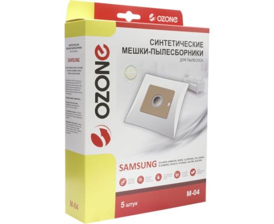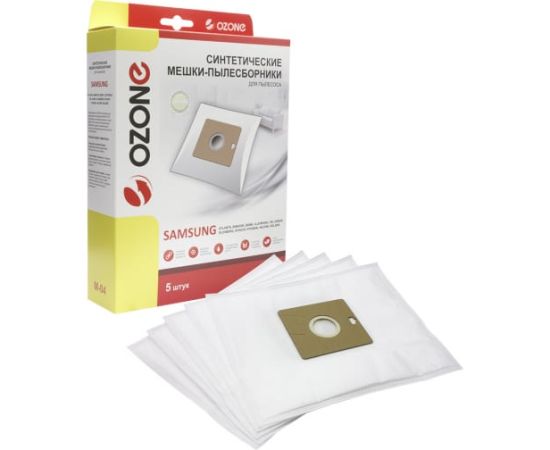 Мешки-пылесборники оригинальные синтетические OZONE (5 шт.) Samsung VP-95 M-04 являются одноразовыми и подходят к бытовым пылесосам. Сочетают в себе как высокую прочность, так и хорошие фильтрационные свойства. Способны удержать мелкие частицы пыли и микроорганизмов. Благодаря особому синтетическому материалу и новым технологиям, использованным в изготовлении пылесборников, могут выдержать до 30 кг нагрузки. Фланец 100х110 мм, отверстие в картоне 45 мм.