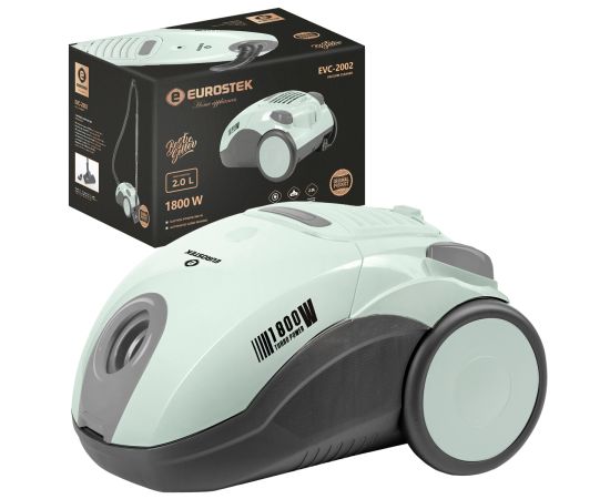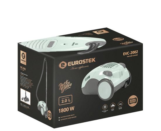 Пылесос с тканевым пылесборником Eurostek EVC-2002 Максимальная мощность 1800 Вт., мощность всасывания 380 Вт., телескопическая металлическая трубка и щетка для пола, объем пылесборника составляет 2 литра, защита от перегрева, автоматическая смотка шнура.
