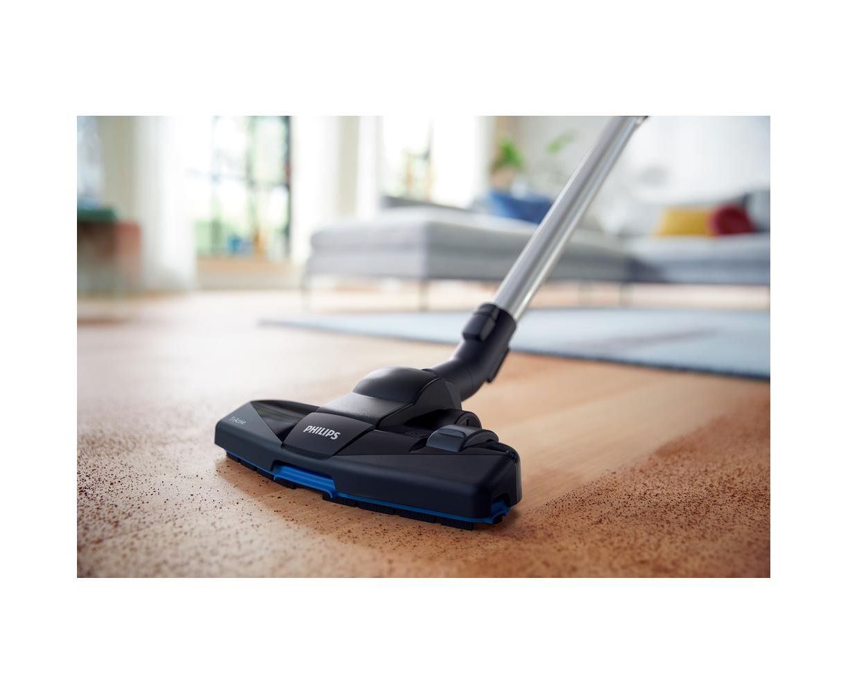 Пылесос из серии Philips PowerPro Compact предлагает высокую производительность в довольно компактном корпусе: размеры устройства составляют 41х28х25 см, а вес — 4.5 кг. Внутри установлен мотор с высокой мощностью 900 Вт, не забыли и о фирменной технологии PowerCyclone 5, которая ускоряет поток воздуха в камере для более эффективного отделения пыли и поддержания высокой силы всасывания. При этом система фильтрации Allergy H13, уровень которой эквивалентен HEPA 13, удерживает 99.9% мелких частиц, в том числе пыльцу, шерсть животных и пылевых клещей, что особенно важно для людей, страдающих аллергией. Вместо мешка Philips PowerPro Compact FC 9331 использует пластиковый контейнер с системой циклон объемом 1.5 л, который можно легко и быстро очистить, не запачкав руки. Радует и комплектация модели, в которую включены сразу четыре насадки. Это основная щетка TriActive, которая предназначена для любого покрытия и всасывает больше мусора благодаря дополнительным отверстиям спереди и по бокам, встроенная в ручку пылевая щетка, а также щелевая и насадка для твердых напольных покрытий. А шнур длиной 6 метров обеспечивает свободу действий и помогает добраться до самых укромных уголков помещения.