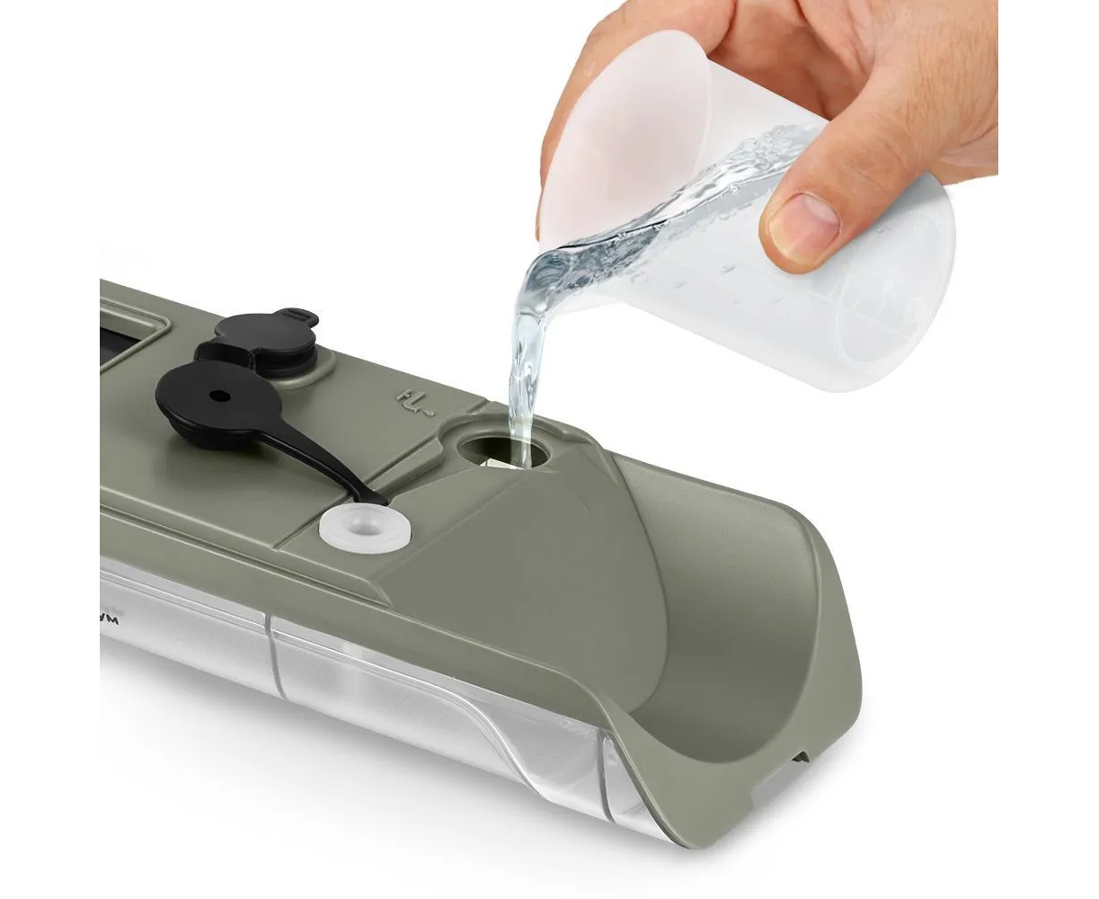 Резервуар для воды съёмный и имеет 2 отсека: для чистой и грязной воды. Из отсека для чистой воды пылесос распыляет воду на поверхность, которую вы собираетесь очистить, затем эту воду пылесос засасывает, и она поступает в отсек для грязной воды.