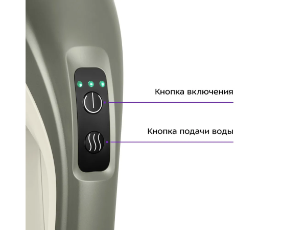 После нажатия на кнопку включения загорается подсветка, а также на секунду загораются зелёным три индикатора заряда над кнопкой включения. Вода подаётся при нажатии на кнопку подачи воды.