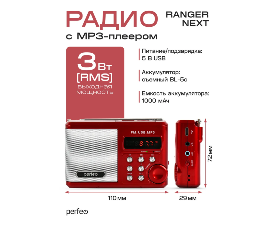 Радиоприемник Bluetooth цифровой Perfeo Sound Ranger Next/ УКВ+FM/ MP3/ Bluetooth 5.3/ 1000 mAh/ Красный, (Арт. PF_D0563)