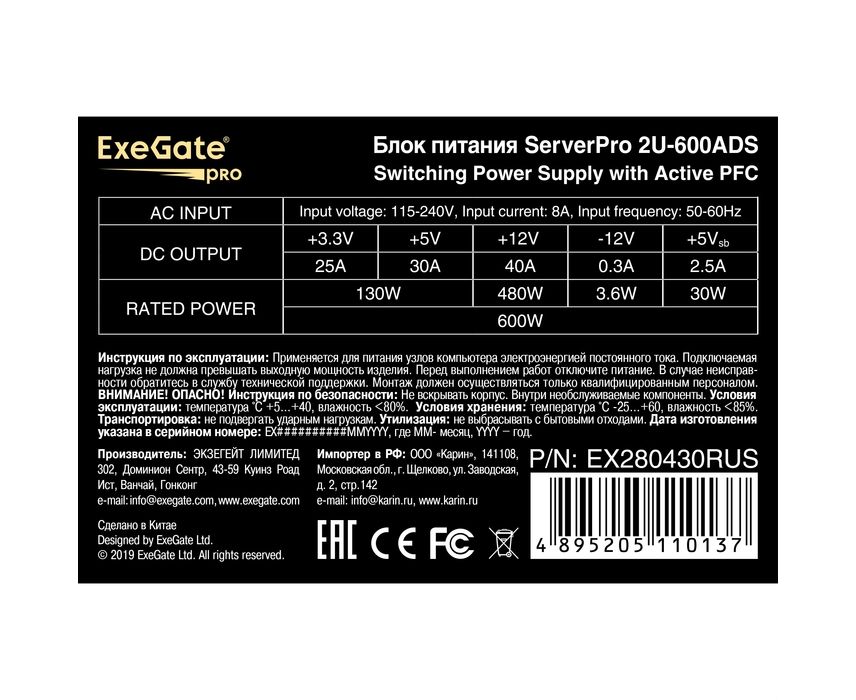Серверный БП Exegate EX280430RUS 600W (ServerPRO-2U-600ADS) APFC, унив. для 2U, 24pin, 2*8pin, 5xSATA, 3xIDE