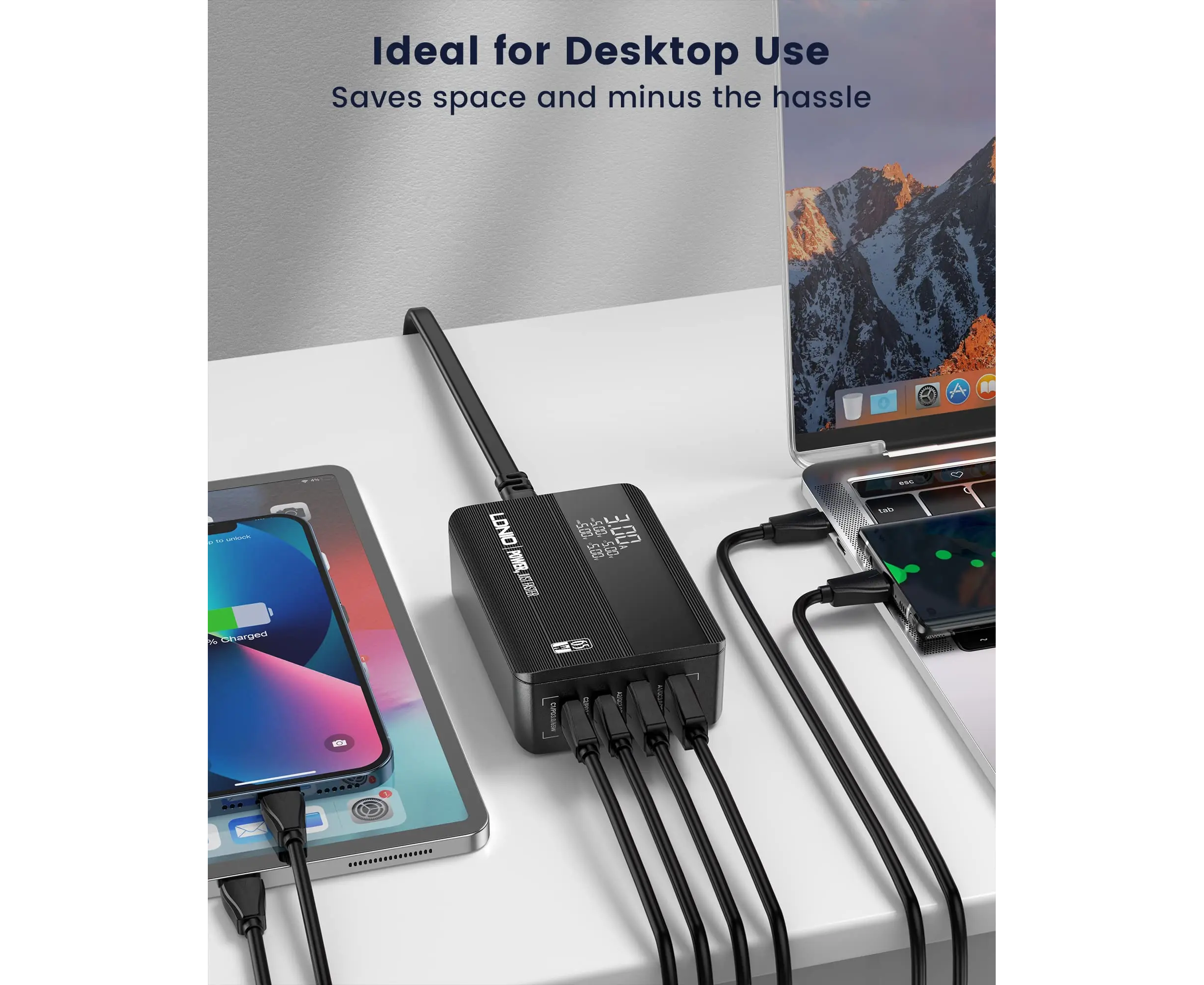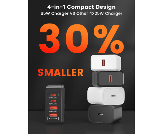 Универсальное зарядное устройство LDNIO A4808Q 65W 2*USB-C 2*USB Чёрный Компактный и портативный настольный блок мощностью зарядки в 65W встроенными протоколами быстрой зарядки делает настольный блок зарядки LDNIO незаменимым в повседневной жизни для зарядки повседневных гаджетов и аксессуаров. USB-C1):5V-3A,9V-3A,12V-3A ,15V-3A,20V-3.25A [65W MAX] (USB-C2): 5V-3A,9V-2.22A,12V-1.67A [20W MAX] (USB-A1):5V-3A,9V-3A,12V-2.5A [30W MAX] (USB-A1):5V-3A,9V-3A,12V-2.5A [30W MAX]