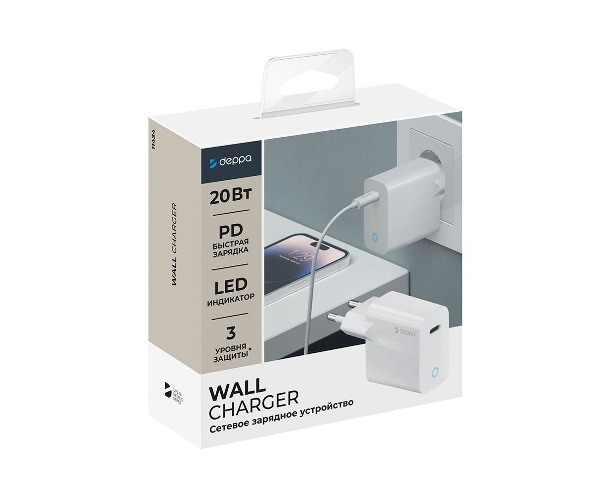 Сетевое зарядное устройство USB Type-C, Power Delivery, 20Вт, белый, Deppa, 11424