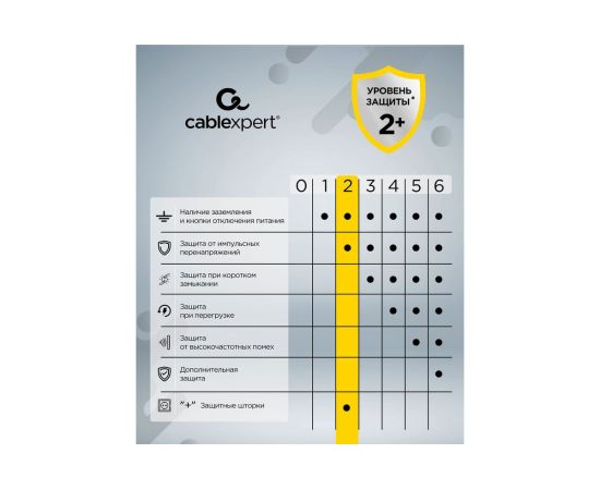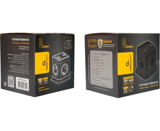 Технические характеристики Cablexpert tower 4р, 10а, 1xtype-c pd, 20Вт, 2хusb, 2м, уровень защиты 4+, черный, коробка TWR-4-CU2-B-2