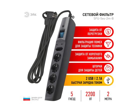 Сетевой фильтр 5 розеток, 2 USB, 2м, с/з, шторками и выключателем, черный, SFU-5es-2m-B ЭРА C0043326 отличается многофункциональностью, что делает его необходимым атрибутом современного дома. Сетевой фильтр имеет шнур длиной 2м, такой удлинитель оптимальный для использования в пределах одной комнаты. Для большего удобства он имеет выключатель.