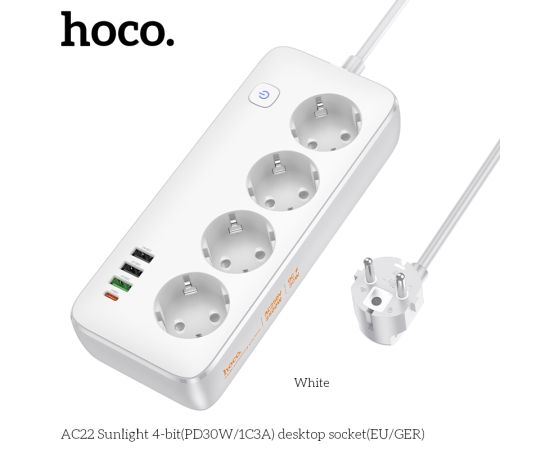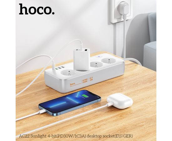 Сетевой фильтр HOCO AC22 Sunlight 4-bit (PD30W/1C3A) (L=1.5M) (белый)