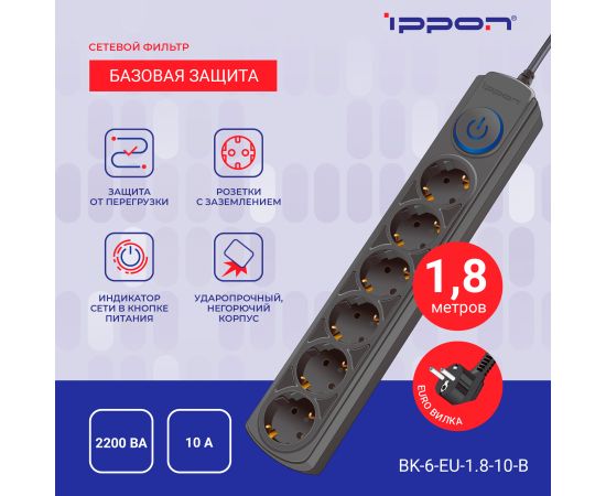 Сетевой фильтр Ippon BK-6-EU-1.8-10-B (1.8м 6 розеток черный)