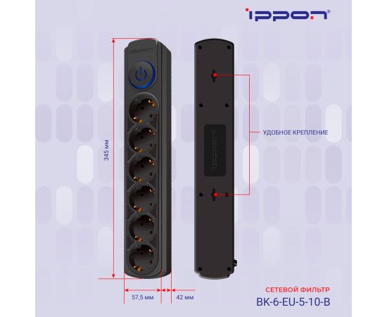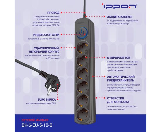 Сетевой фильтр Ippon BK-6-EU-5-10-B (5м 6 розеток черный)