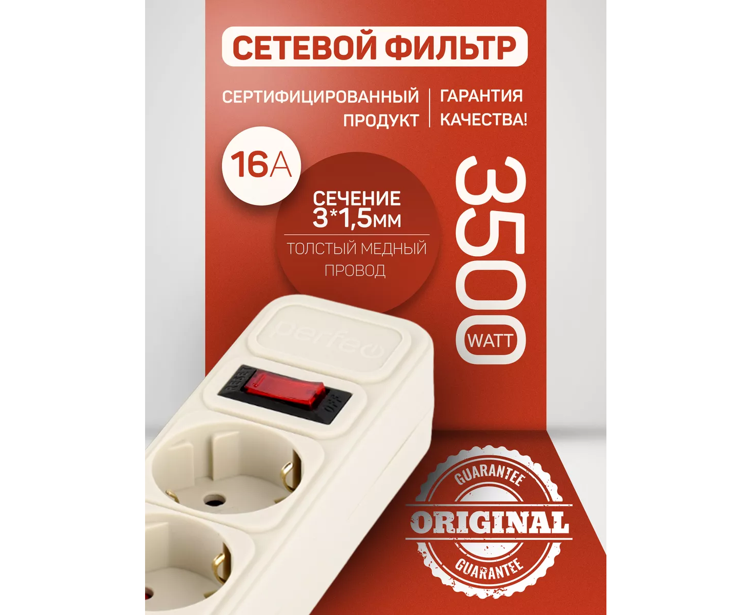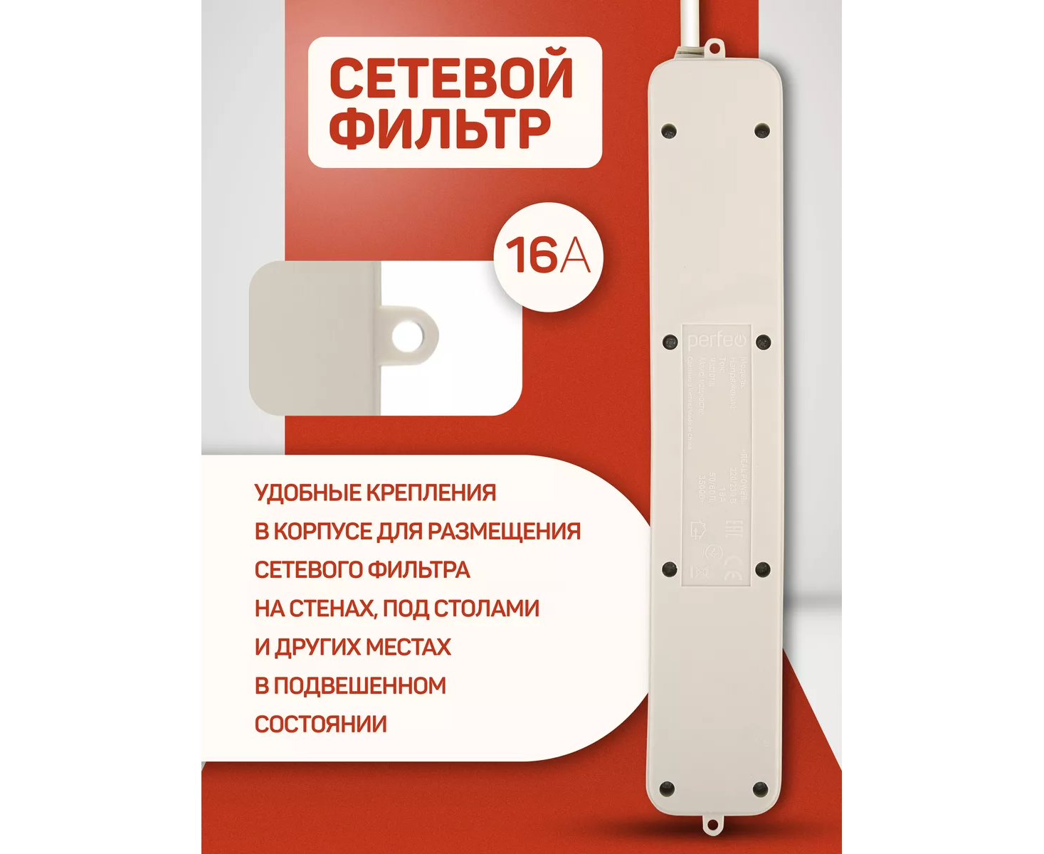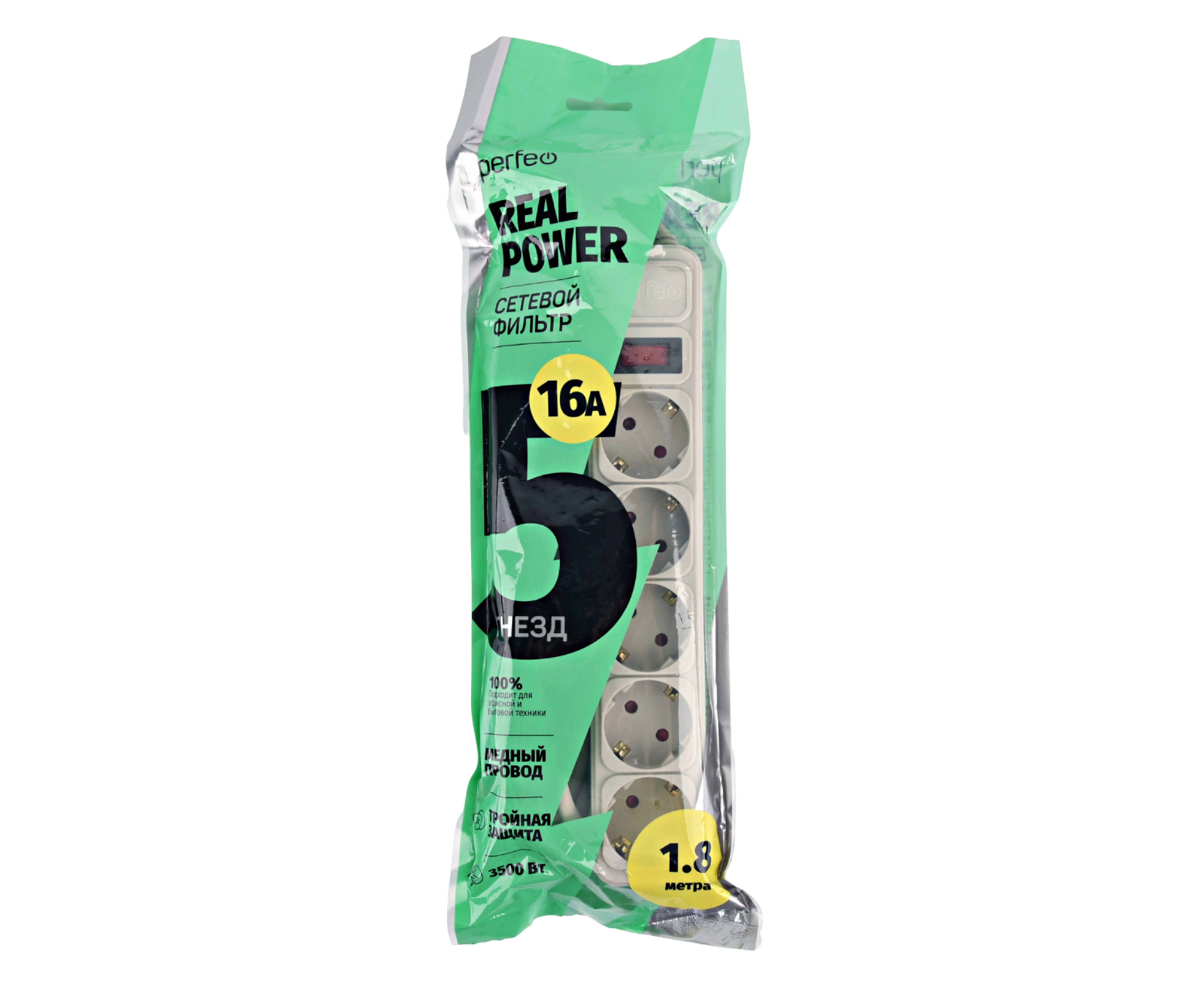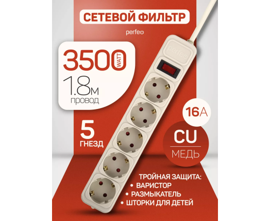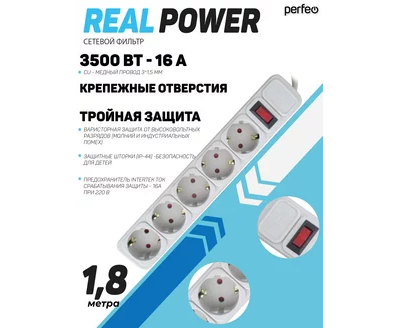 Сетевой фильтр Perfeo "REAL POWER", 1,8м, 5 розеток, 16А, 3500 Вт, тройная защита, белый