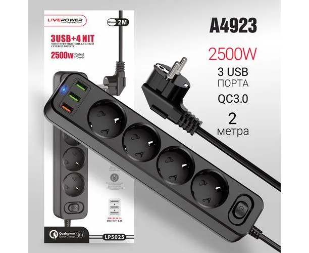 Сетевой фильтр-удлинитель Live-Power LP5025 3USB+QC3.0 + 4 розетки 2000mm Black