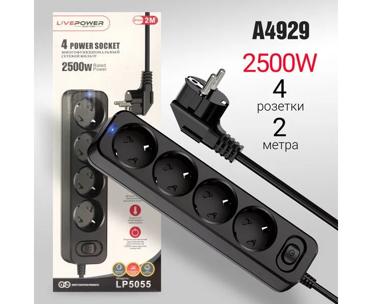 Сетевой фильтр-удлинитель Live-Power LP5055 4 розеток 2000mm Black