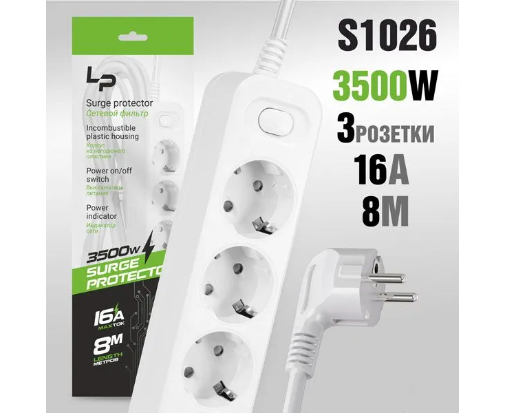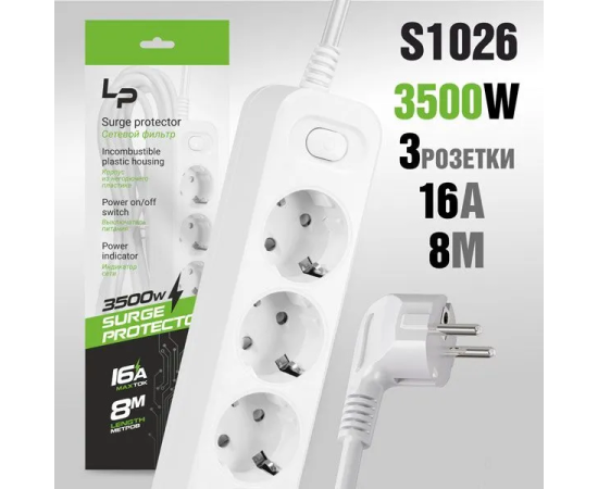 Сетевой фильтр-удлинитель LP LP1014 3розетки С/З 10А с выкл. 8м white