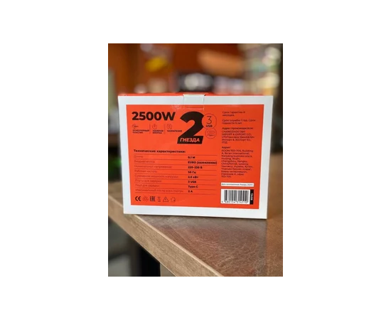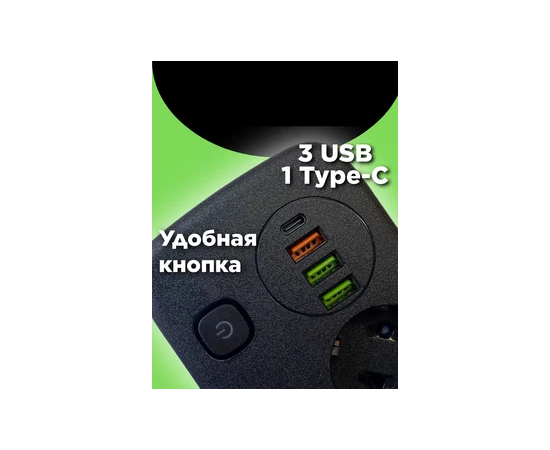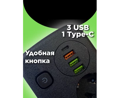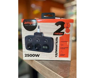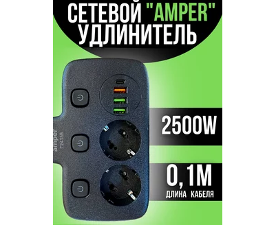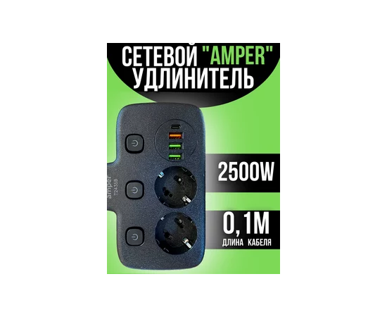 Сетевой удлинитель, Amper 0,2м, 2 розетки, 3*0,75мм, 10А, 2500 Вт, 3usb, 1Type-C, 3кн, черный
