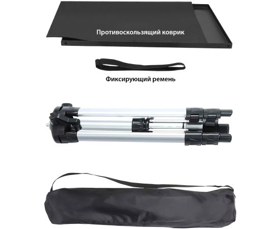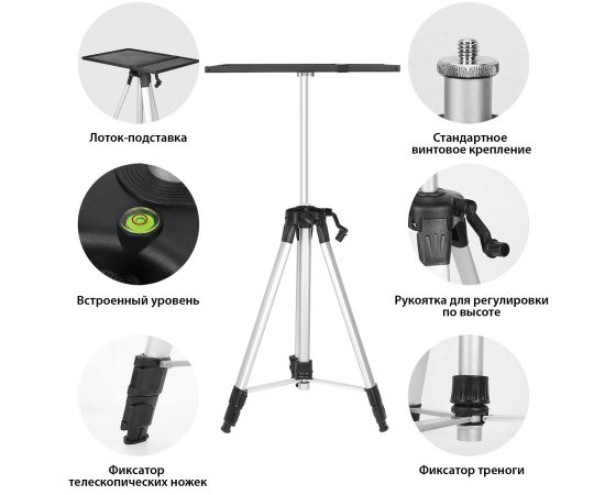 Размеры столика штатива составляют 380 х 280 см, что обеспечивает достаточное пространство для установки устройства подходящего размера. Материал ножек – алюминий, что не только говорит о прочности изделия, но и придает ему элегантный и стильный вид.