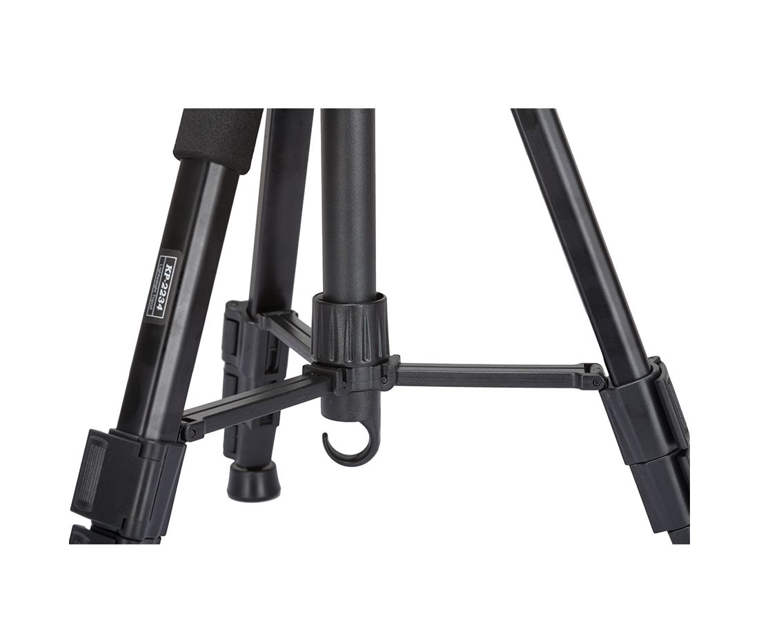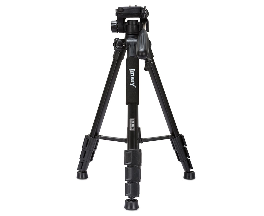 Компактный штатив Jmary KP-2234 подходит как для любительской, так и профессиональной съемки. Он совместим со всеми современными видеокамерами и цифровыми фотоаппаратами. Отличается своей прочностью, легкостью и простотой эксплуатации. Специальный поворотный механизм и ручка позволяют выполнять съемку движущихся объектов и панорам.Штативная головка обеспечивает максимальную плавность хода. Ножки оснащены специальными резиновыми шипами, которые не скользят и обеспечивают максимальную устойчивость. Головка имеет пузырьковый уровень, который позволяет установить камеру идеально ровно. Микролифт фиксируется при помощи зажимного винта. Одна из трех секций может поворачиваться в сторону. Данная функция позволяет выполнить портретный снимок. Для безопасного хранения и транспортировки в комплект поставки входит сумка-чехол. Особенности и функции3D голова. Вращение головы вокруг вертикальной и горизонтальной оси происходит независимо. Благодаря этому штатив можно использовать для панорамной фотосъемки или видеосъемки. Третья ось позволяет наклонить камеру вбок для перехода в "портретный" режим. Длинная рукоятка позволит вращать камеру плавно, без резких рывков.Пузырьковый уровень. Голова оборудована пузырьковым уровнем для выставления камеры по горизонту.Быстросъемная площадка. На площадке находится винт 1/4" со скобой для комфортного закручивания. Площадка с камерой легко и быстро устанавливается на штатив, надежно удерживается подпружиненным зажимом.Подъемная центральная колонна. Реечный микролифт позволяет плавно регулировать высоту штатива, без необходимости перенастройки положения ног. Микролифт является востребованной функцией при выборе, смене или чередовании ракурсов съемки. Рукоятка микролифта складывается после регулировки и не мешает съемке или транспортировке. Положение микролифта фиксируется винтом.Секции ног надежно фиксируются клипсовыми замками. На концах ног установлены резиновые наконечники с шаровым основанием, которые позволят добиться максимальной устойчивости на любых поверхностях.Удобный в эксплуатации. Благодаря растяжке, расположенной на верхней секции, подготовка штатива к работе и выравнивание происходит быстрее и легче. Для дополнительной стабильности и устойчивости предусмотрен специальный крюк.