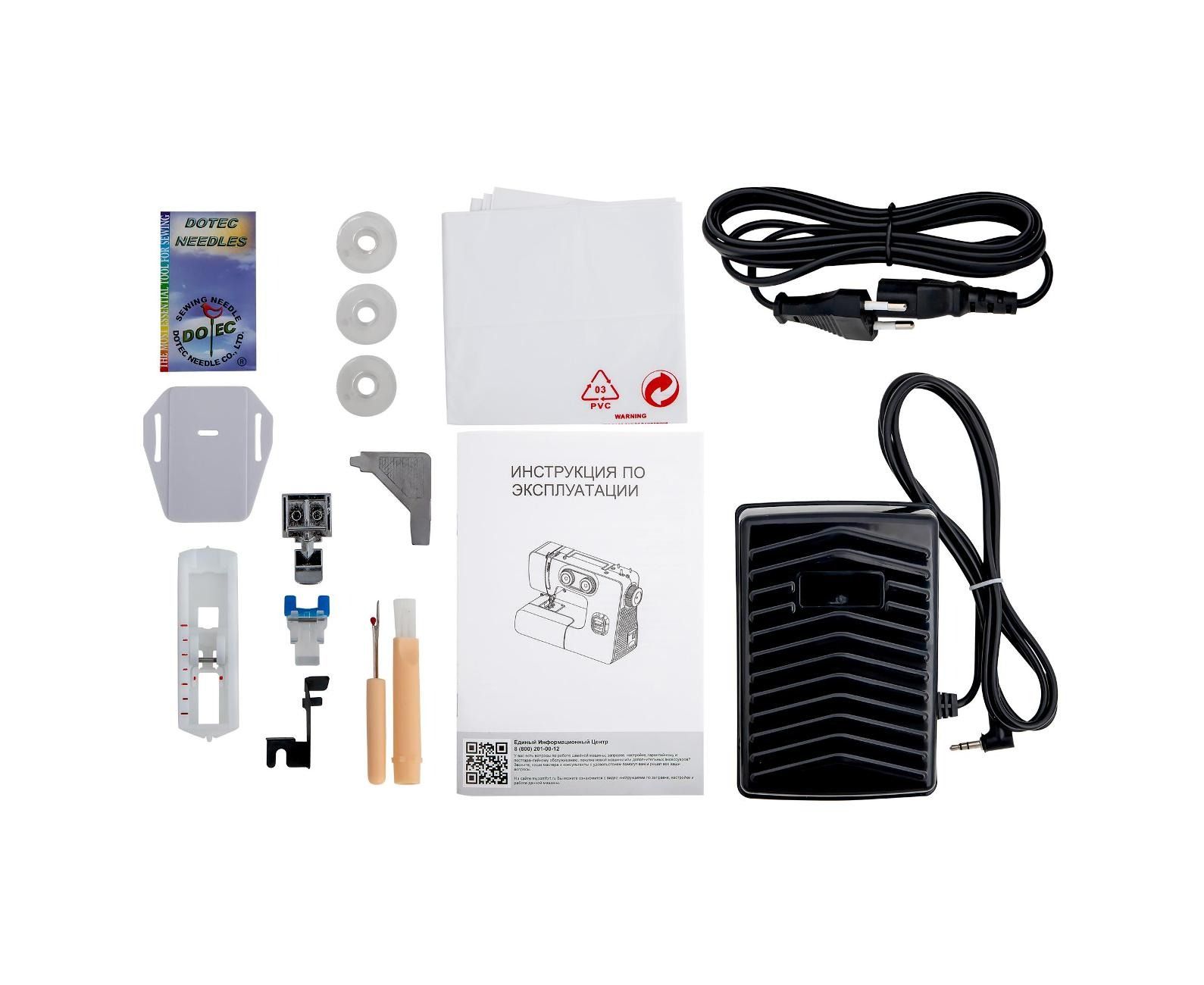 комплект игл (130/705H), шпулька (3 шт., материал — пластик), педаль, отвертка, щеточка, инструкция, сетевой шнур (длина — 1.4 м), вспарыватель, подсветка рабочей зоны, штопальная пластина