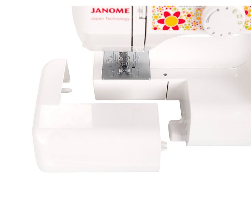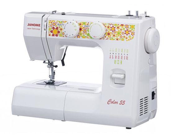 Электромеханическая швейная машина Janome Color 55 имеет все основные швейные операции: рабочие, трикотажные, оверлочные, потайные, а также декоративные строчки. Петля выполняется в полуавтоматическом режиме. Janome Color 55 имеет съёмную рукавную панель, которая позволяет без проблем шить узкие изделия, такие как манжеты рукавов, брючины и детские вещи. Это простая в управлении швейная машина подойдёт и новичкам, и тем, кто уже умеет неплохо шить.