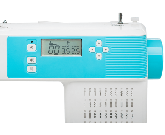 На дисплее управления отображаются все режимы работы машины: тип строчки, ширина и длина стежка, тип используемой лапки, положение иглы, реверс/закрепка шва, необходимость использования рычага обметывания петель, режим намотки шпульки.