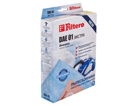 Пылесборник FILTERO DAE 01 (4) экстра. Мешки-пылесборники Filtero DAE 01 ЭКСТРА Anti-Allergen, 4 штуки. Пылесборники Filtero ЭКСТРА Anti-Allergen произведены из синтетического микроволокна MicroFib с антибактериальной пропиткой Anti-Bac. Очень прочные, они не боятся острых предметов и влаги, собирают больше пыли (до 50%) и обеспечивают уровень очистки воздуха 99,9%, а также задерживают бактерии и препятствуют их распространению. При этом мощность всасывания пылесоса сохраняется в течение всего периода службы пылесборника.