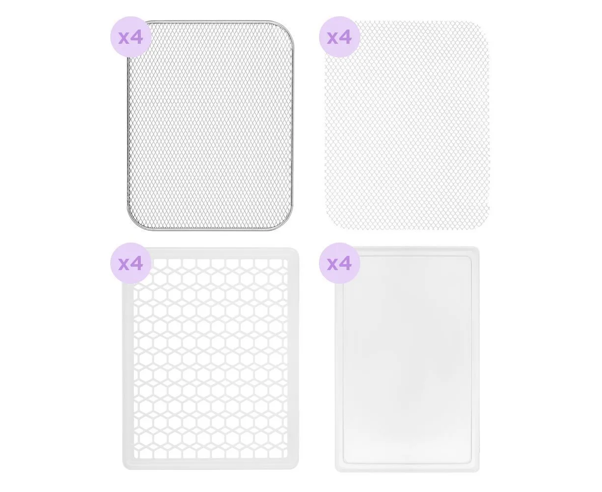 В комплект входят 16 поддонов. Сетки используются для небольших продуктов: травы и ягоды. Металлические и пластиковые поддоны подходят для большинства типов продуктов. Сплошные поддоны служат для сушки водянистых фруктов и овощей, где много сока