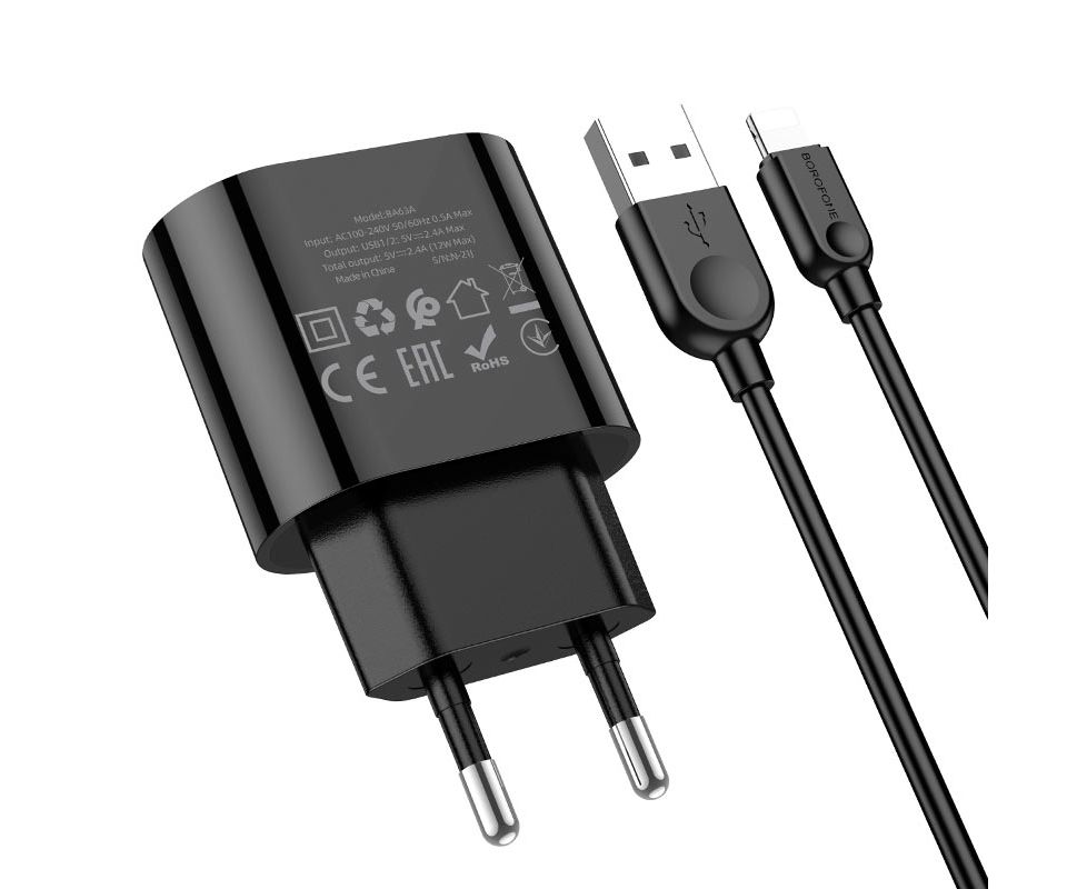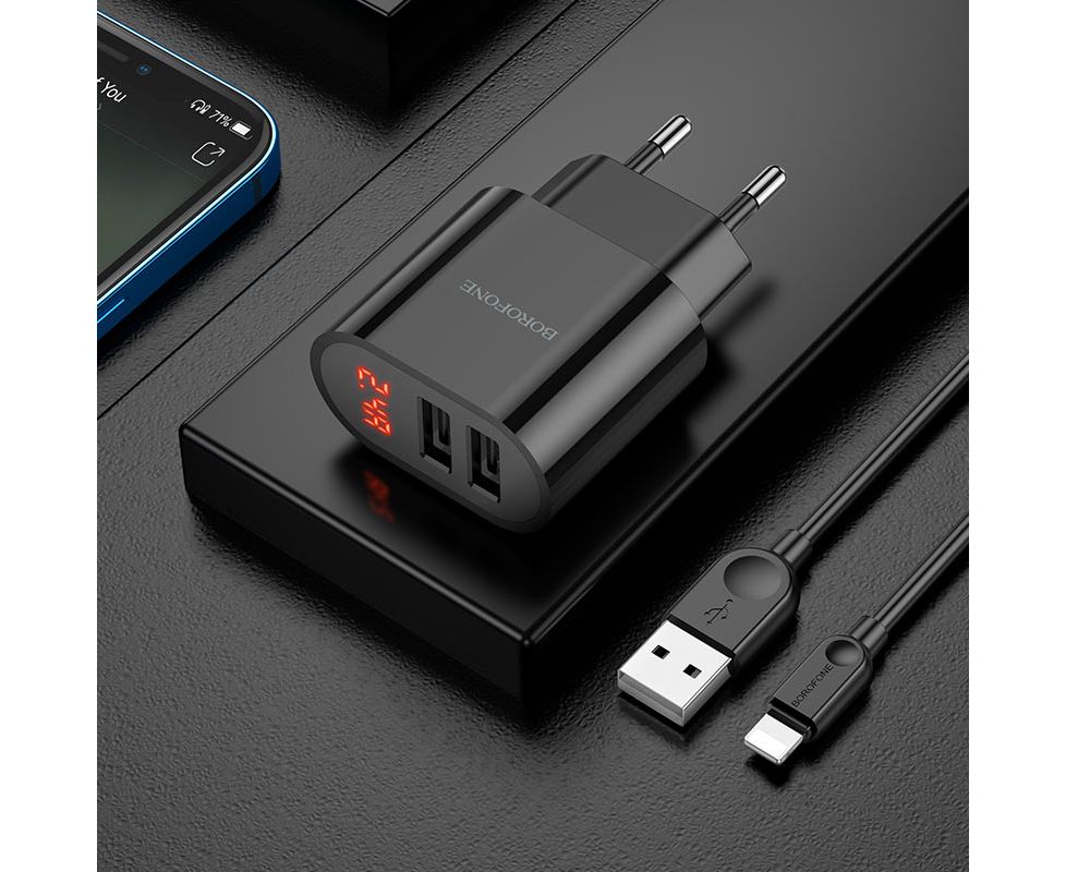 СЗУ BOROFONE BA63A Richy 2USB, 5V, 2.4A digital display + lightning (чёрный)