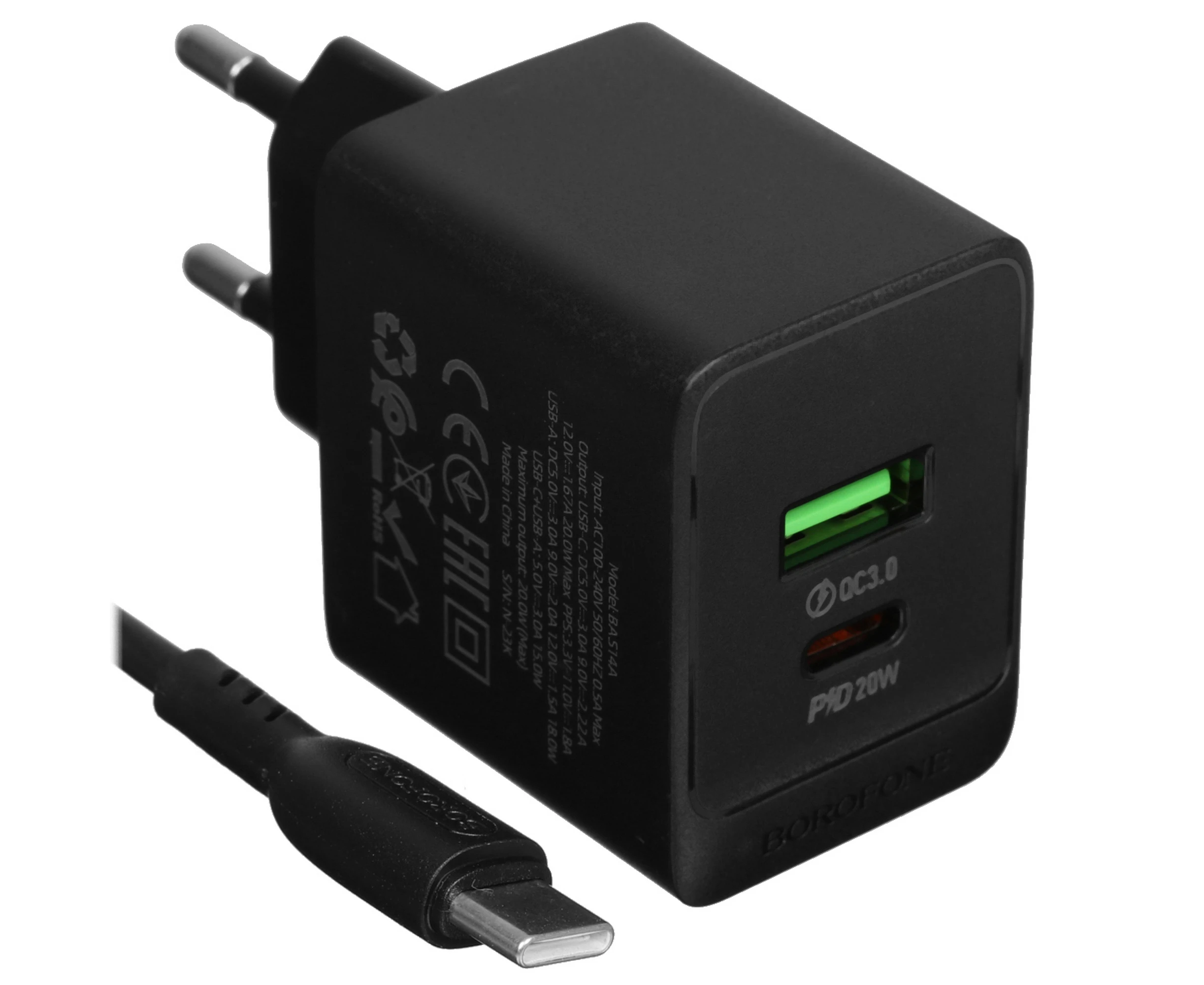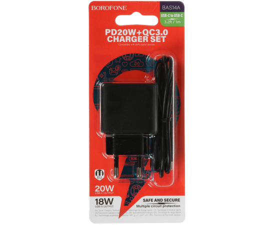 СЗУ Borofone BAS14A 1USB+1Type-C 3.0A QC3.0 PD 20W быстрая зарядка Black