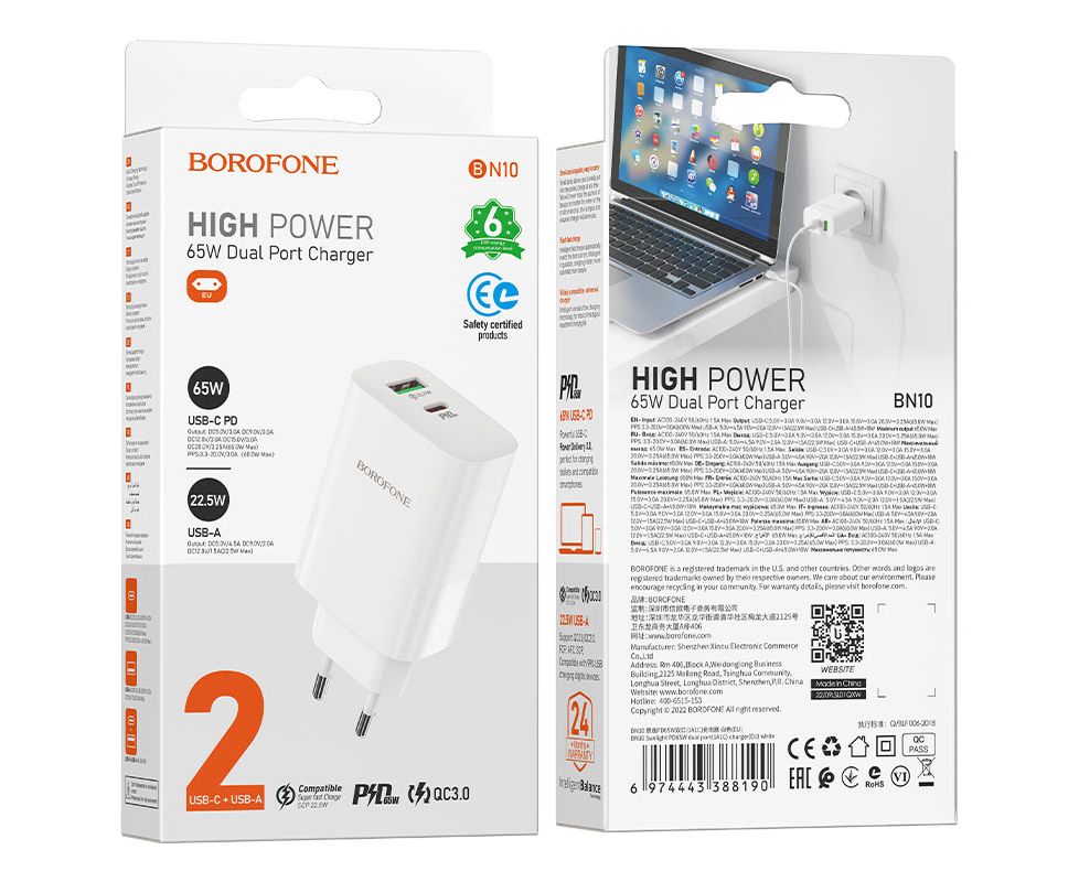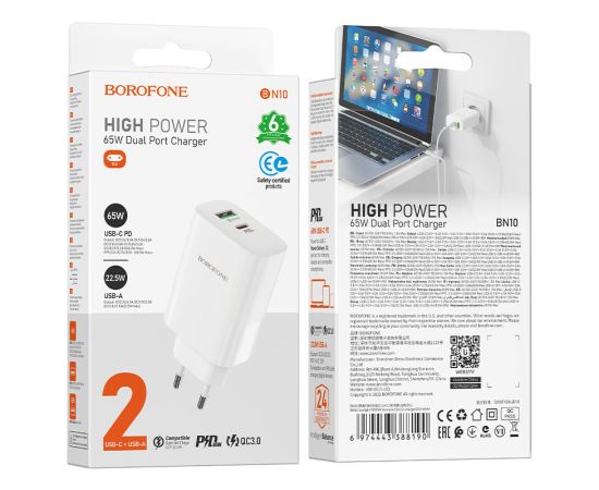 СЗУ BOROFONE BN10 Sunlight 2USB, PD65 (1A1C) (белый)