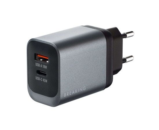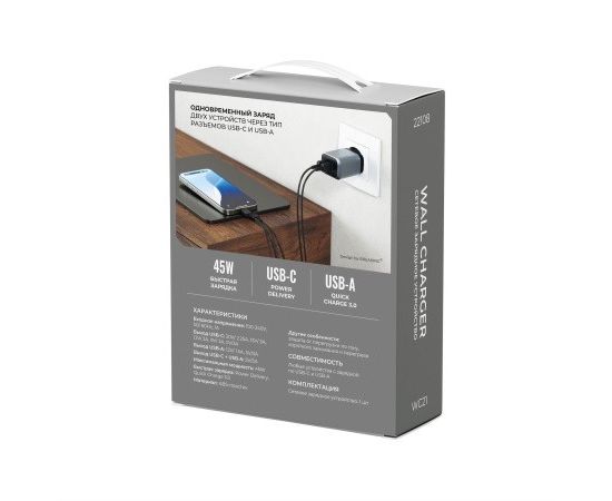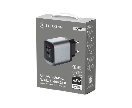 Сетевое зарядное устройство BREAKING WC21, USB-C + USB-А, 45W, QC 3.0, 3.0A выполнено из прочного ABS-пластика. Модель рассчитана на входное напряжение 110-240 V и обеспечивает выходную мощность до 45 W и выходной ток до 3.0 A.
