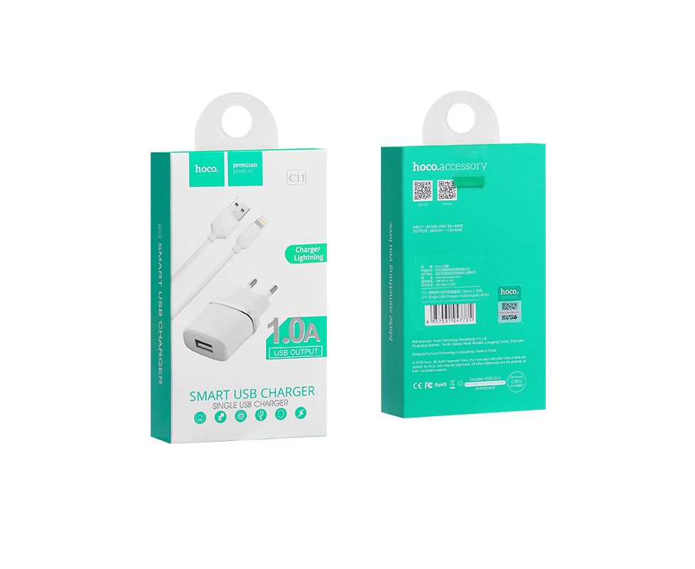 СЗУ HOCO C11 Smart+Lightning white 1Aисключительно для подпитки гаджетов. Корпус зарядного устройства достаточно крепкий и надежный. Высококачественный пластик, из которого сделано устройство, гарантировано не содержит вредных веществ. Помимо прочего, простая монолитная форма делает зарядку менее чувствительной к повреждениям.