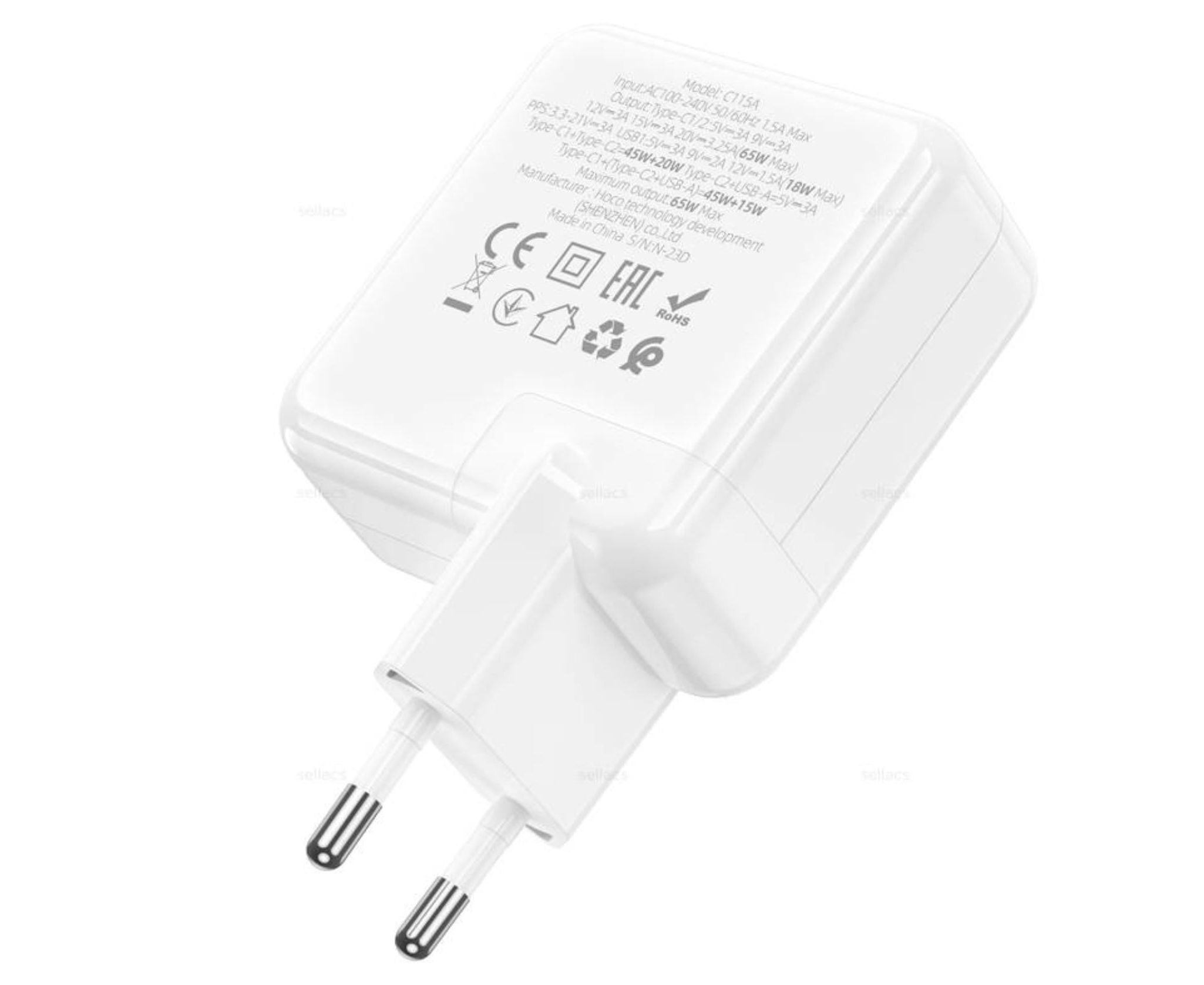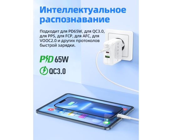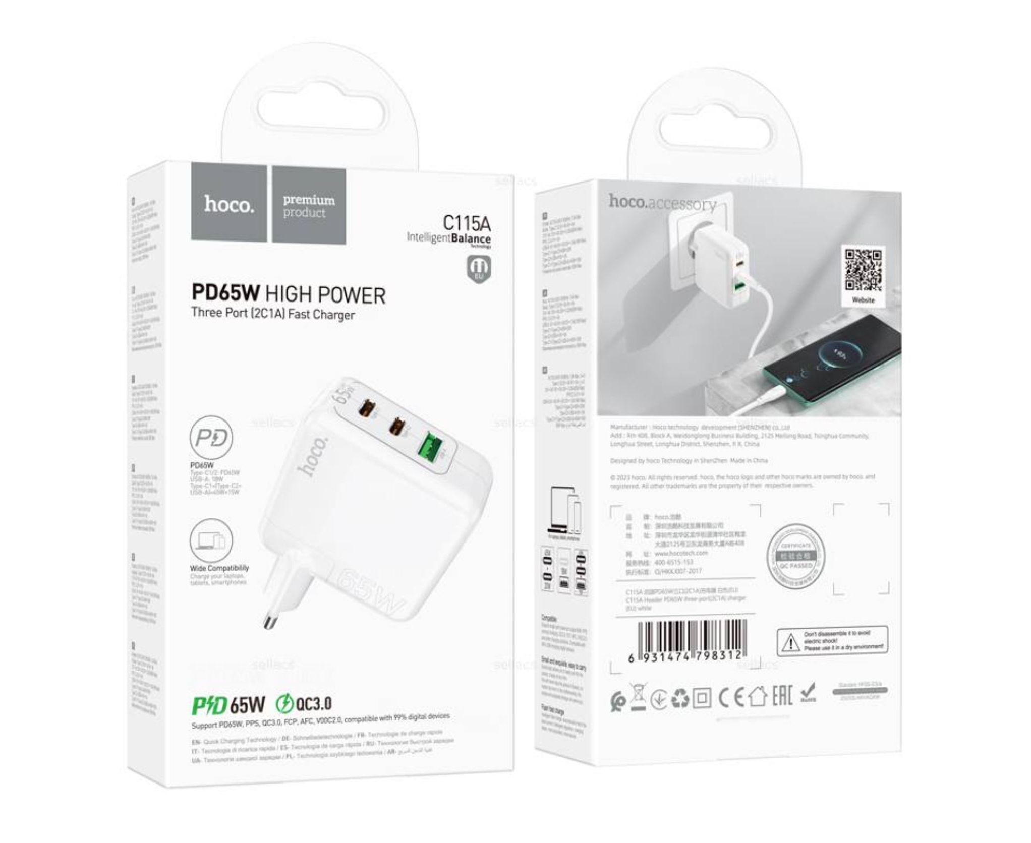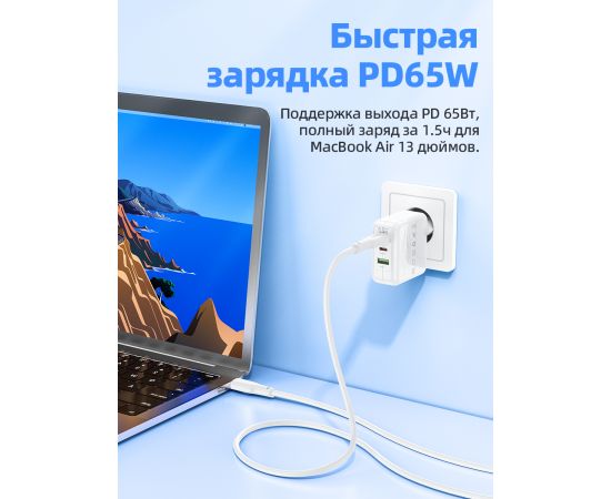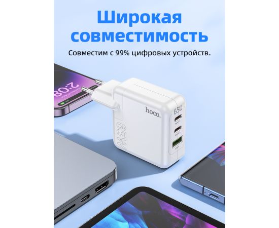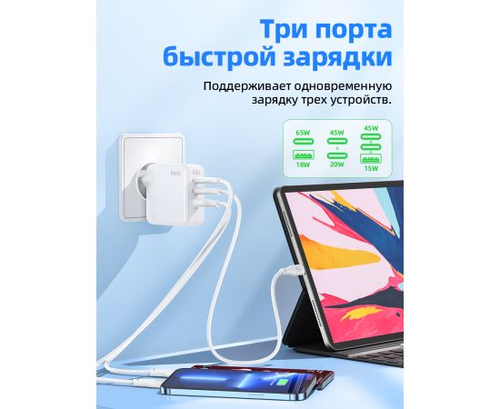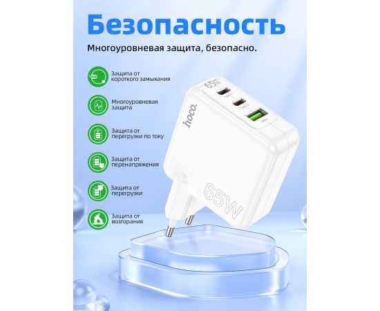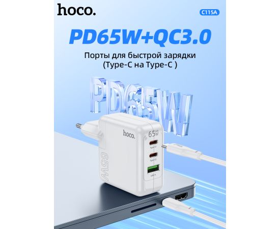 СЗУ HOCO C115A Header 3USB, PD65W, 2C1A charger set + Type-C to Type-C (EU) (белый)