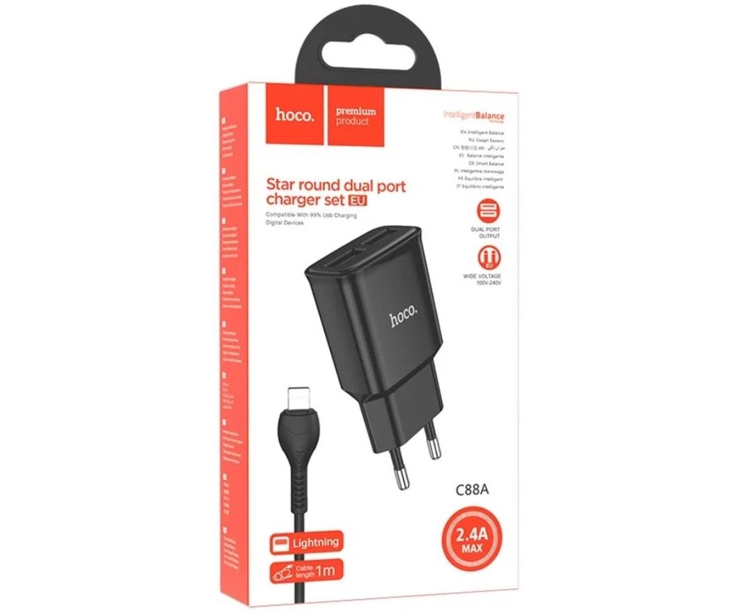 СЗУ HOCO C88A Star round, 2USB, 2.4A + iP (черный)