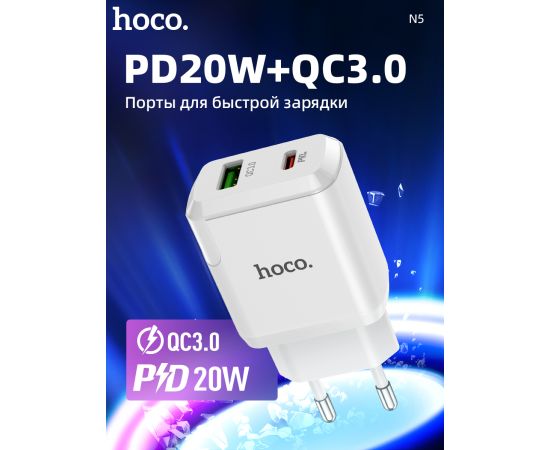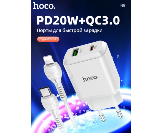 СЗУ HOCO N5 Favor 2USB, PD20W, QC3.0 charger set, Type-C + lightning (белый)