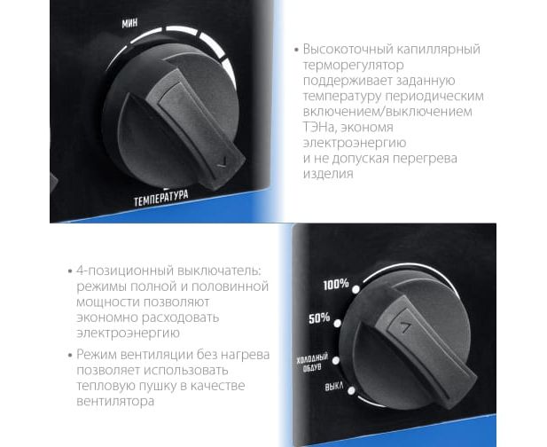 Надёжная доработанная конструкция обеспечивает защиту как пользователя, так и тепловой пушки в случае возникновения нештатных ситуаций.
