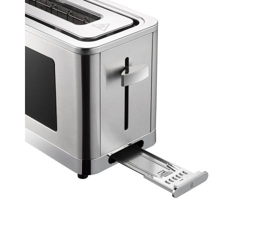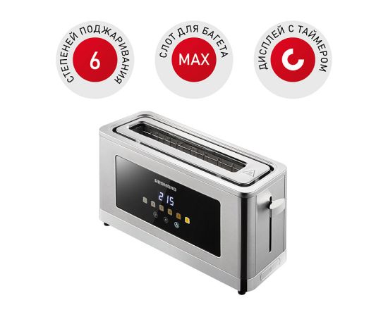 Общие характеристики Тип управления сенсорный Мощность 850 Вт Напряжение 220-240 В, 50 Гц Защита от поражения электрическим током класс I Материал корпуса пластик металл Количество отделений для тостов 1 (удлиненный) Выдвижной поддон для крошек есть Подставка для подогрева булочек есть Регулировка степени обжаривания 6 степеней Плавная регулировка температуры да Функция разморозки и подогрева есть Обратный отсчет времени поджаривания есть Автоматическое центрирование тостов есть Автоматический выброс тостов есть Экстра-подъем тостов да Функция отмены приготовления есть Дисплей да Подсветка элементов управления да