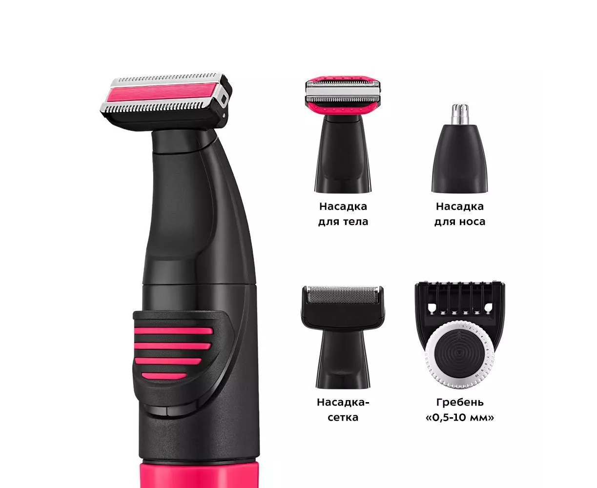 В комплекте к триммеру идёт 4 насадки: гребень с регулировкой длины, насадка для носа, которой можно также удалять волосы из ушей, насадка-сетка для бритья короткой щетины, насадка-триммер для бритья и подравнивания волос на лице и насадка для тела.
