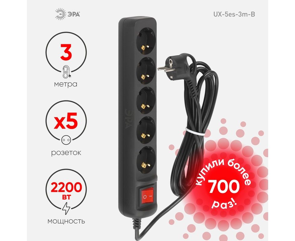 Удлинитель ЭРА UX-5es-3m-B Б0057731 5 розеток 3м черный