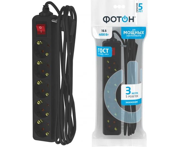 Удлинитель сетевой ФОТОН 22730 16-35ЕS, 3м, 5 розеток, 16А, с выключателем, с заземлением, черный