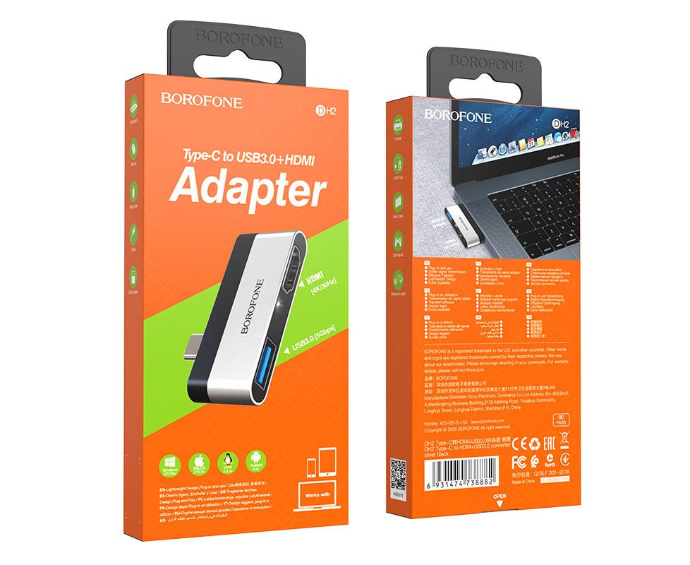 USB-концентратор Borofone DH2, алюминий, Type-C на HDMI, USB 3.0, цвет: серый(1/18/180)